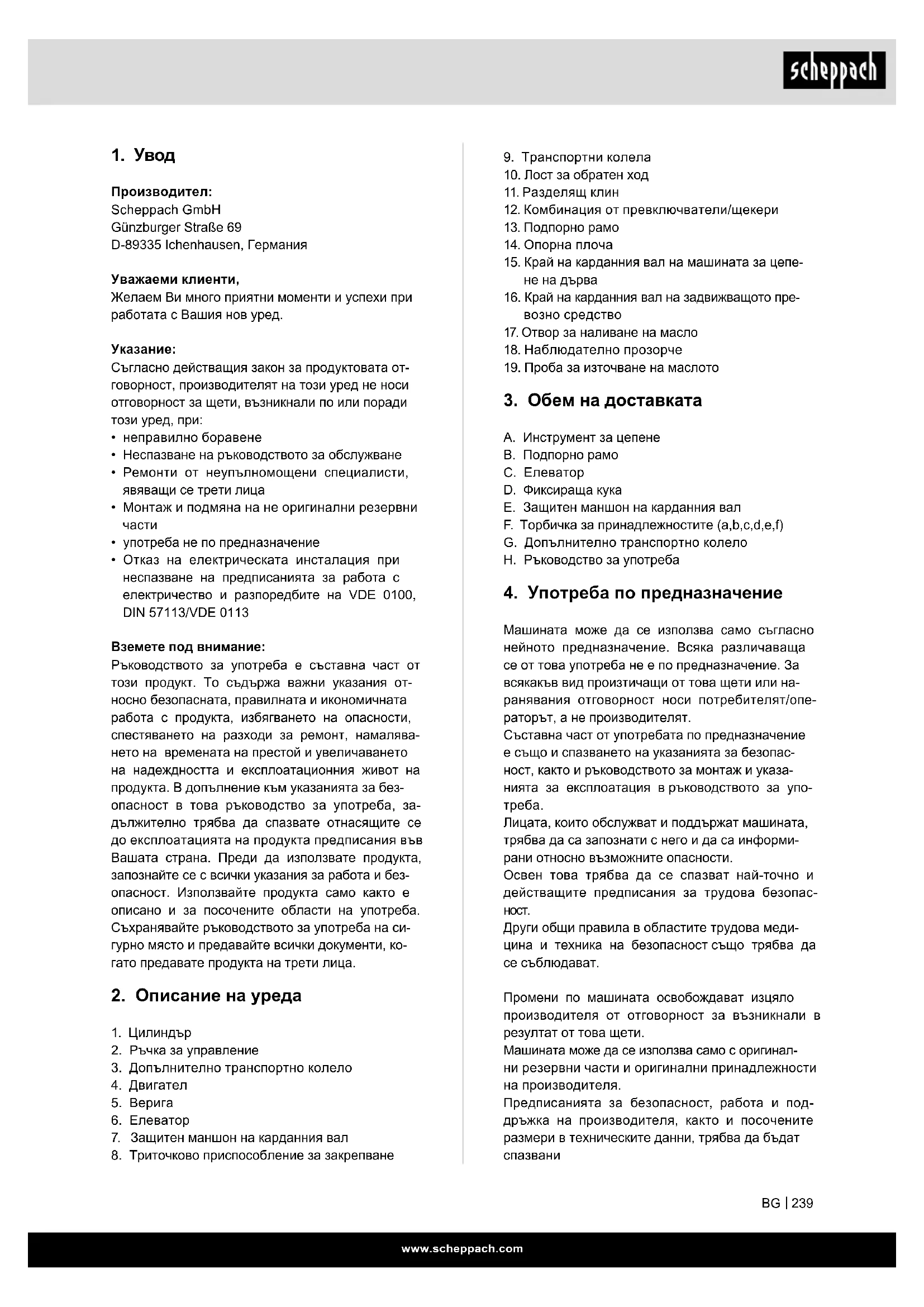 m Внимание! В настоящите инструкции за обслужване с този знак сме обозначили местата, които засягат Вашата безопасност Продуктът отговаря на приложимите европейски директиви. Продуктът отговаря на приложимите сръбски директиви.www.scheppach.com