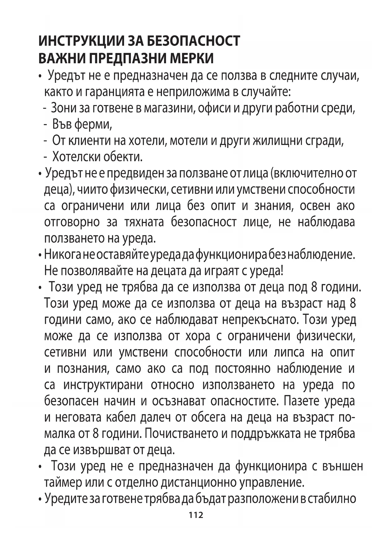 - Уредът не е предвиден за ползване от лица (включително от деца), чиито физически, сетивни или умствени способности са ограничени или лица без опит и знания, освен ако отговорно за тяхната безопасност лице, не наблюдава ползването на уреда.