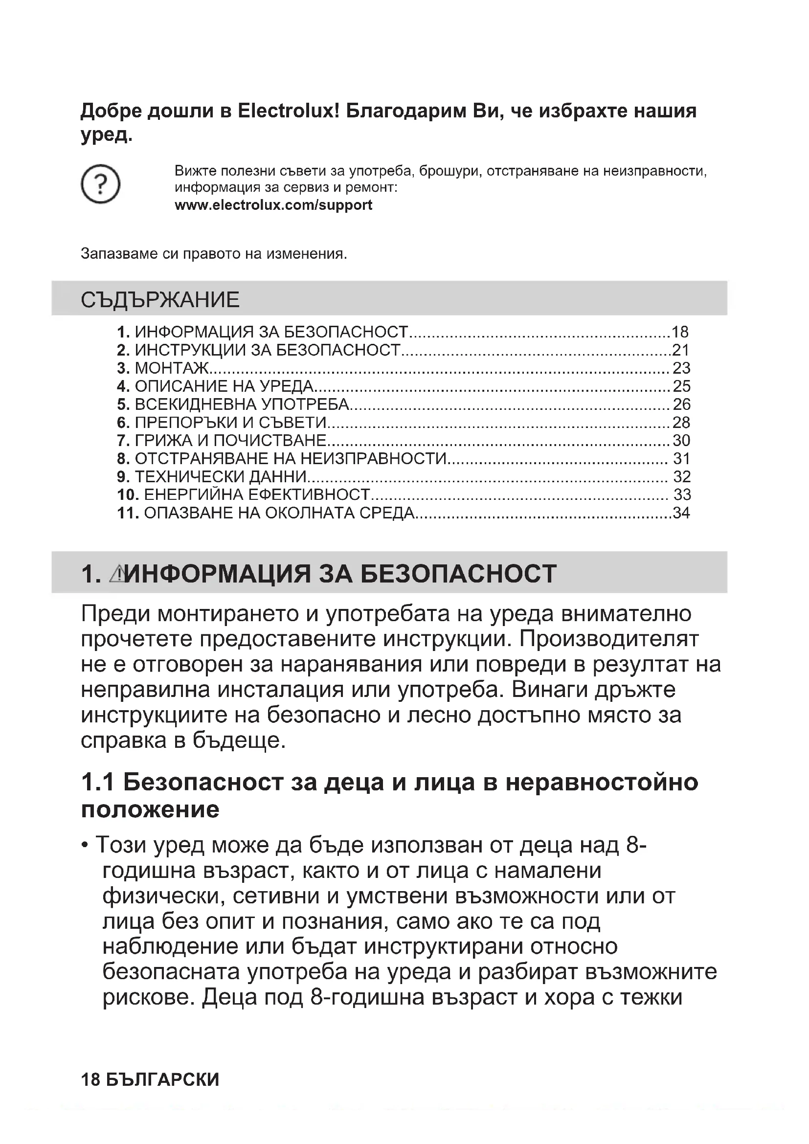 Вижте полезни съвети за употреба, брошури, отстраняване на неизправности,информация за сервиз и ремонт:www.electrolux.com/supportЗапазваме си правото на изменения. 1. ИНФОРМАЦИЯ ЗА БЕЗОПАСНОСТ..........................................................182. ИНСТРУКЦИИ ЗА БЕЗОПАСНОСТ............................................................21