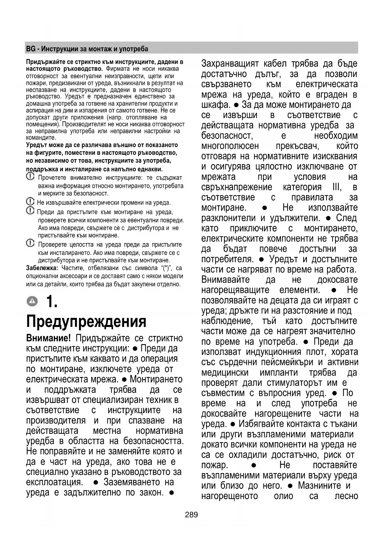 Ha a fenti ellenőrzés után a hibajelzés továbbra is fennmarad, vegye fel a kapcsolatot a legközelebbi műszaki szervizzel.289 BG - Инструкции за монтаж и употреба Придържайте се стриктно към инструкциите, дадени в настоящото ръководство. Фирмата не носи никаква отговорност за евентуални неизправности, щети или пожари, предизвикани от уреда, възникнали в резултат на неспазване на инструкциите, дадени в настоящото ръководство. Уредът е предназначен единствено за домашна употреба за готвене на хранителни продукти и аспирация на дим и изпарения от самото готвене. Не се допускат други приложения (напр. отопляване на помещения). Производителят не носи никаква отговорност за неправилна употреба или неправилни настройки на