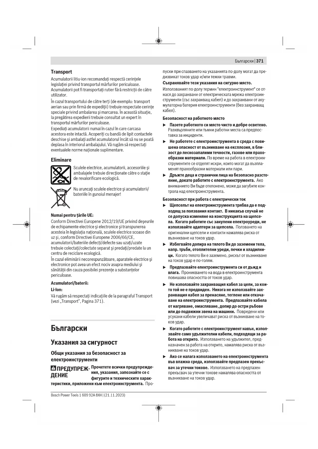 Bosch Power Tools 1 609 92A 8XH | (21.11.2023)376 | Български u Складирайте работните инструменти в сгради в су- хо, равномерно темперирано и защитено от студ
