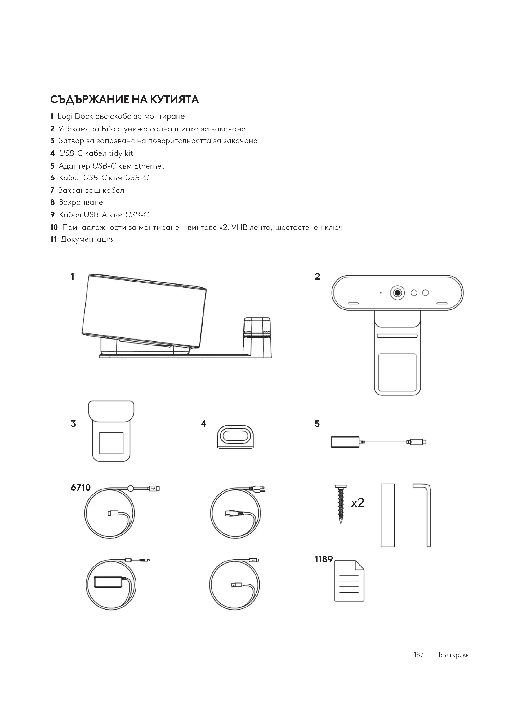СЪДЪРЖАНИЕ НА КУТИЯТА 1 Logi Dock със скоба за монтиране 2 Уебкамера Brio с универсална щипка за закачане 3 Затвор за запазване на поверителността за закачане 4 USB-C кабел tidy kit 5 Адаптер USB-C към Ethernet 6 Кабел USB-C към USB-C 7 Захранващ кабел 8 Захранване 9 Кабел USB-A към USB-C 10 Принадлежности за монтиране – винтове x2, VHB лента, шестостенен ключ 11 Документация 187 Български1 2 3