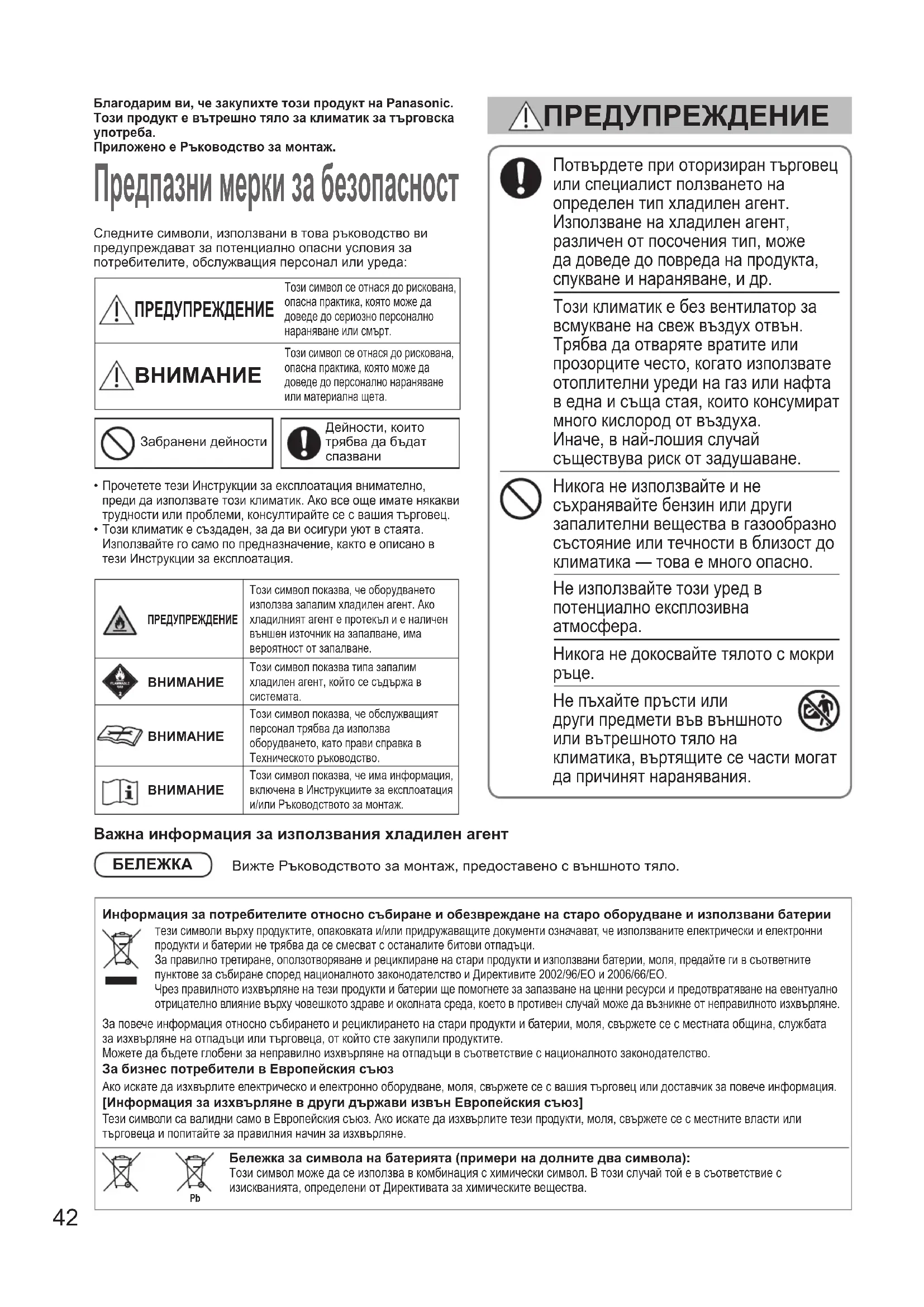 Не пъхайте пръсти или други предмети във външното или вътрешното тяло на климатика, въртящите се части могат да причинят наранявания. ПРЕДУПРЕЖДЕНИЕ ПРЕДУПРЕЖДЕНИЕТози символ показва, че оборудването използва запалим хладилен агент. Ако хладилният агент е протекъл и е наличен външен източник на запалване, има вероятност от запалване.ВНИМАНИЕТози символ показва типа запалим хладилен агент, който се съдържа в системата.ВНИМАНИЕТози символ показва, че обслужващият персонал трябва да използва оборудването, като прави справка в Техническото ръководство.ВНИМАНИЕТози символ показва, че има информация, включена в Инструкциите за експлоатация и/или Ръководството за монтаж.Важна информация за използвания хладилен агентБЕЛЕЖКА Вижте Ръководството за монтаж, предоставено с външното тяло.Информация за потребителите относно събиране и обезвреждане на старо оборудване и използвани батерии