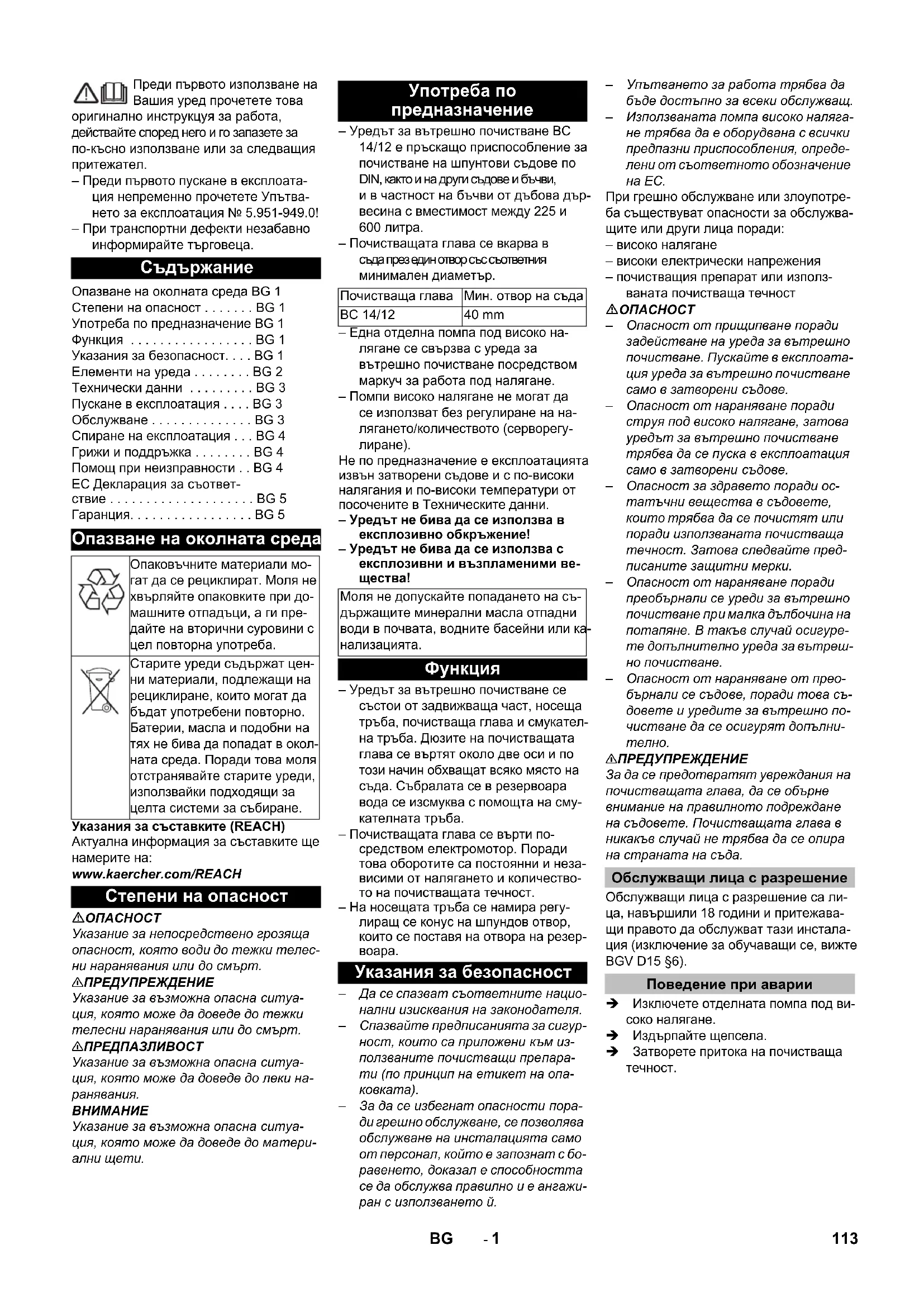 Опазване на околната среда BG 1 Степени на опасност . . . . . . . BG 1 Употреба по предназначение BG 1 Функция . . . . . . . . . . . . . . . . . BG 1 Указания за безопасност. . . . BG 1 Елементи на уреда . . . . . . . . BG 2 Технически данни . . . . . . . . . BG 3 Пускане в експлоатация . . . . BG 3 Обслужване . . . . . . . . . . . . . . BG 3 Спиране на експлоатация . . . BG 4 Грижи и поддръжка . . . . . . . . BG 4 Помощ при неизправности . . BG 4 EC Декларация за съответ- ствие . . . . . . . . . . . . . . . . . . . . BG 5 Гаранция. . . . . . . . . . . . . . . . . BG 5 Опазване на околната среда Опаковъчните материали мо- гат да се рециклират. Моля не хвърляйте опаковките при до- машните отпадъци, а ги пре- дайте на вторични суровини с цел повторна употреба. Старите уреди съдържат цен- ни материали, подлежащи на рециклиране, които могат да бъдат употребени повторно. Батерии, масла и подобни на тях не бива да попадат в окол- ната среда. Поради това моля отстранявайте старите уреди, използвайки подходящи за целта системи за събиране. Степени на опасност Употреба по предназначение Почистваща глава Мин. отвор на съда BC 14/12 40 mm Моля не допускайте попадането на съ- държащите минерални масла отпадни води в почвата, водните басейни или ка- нализацията.