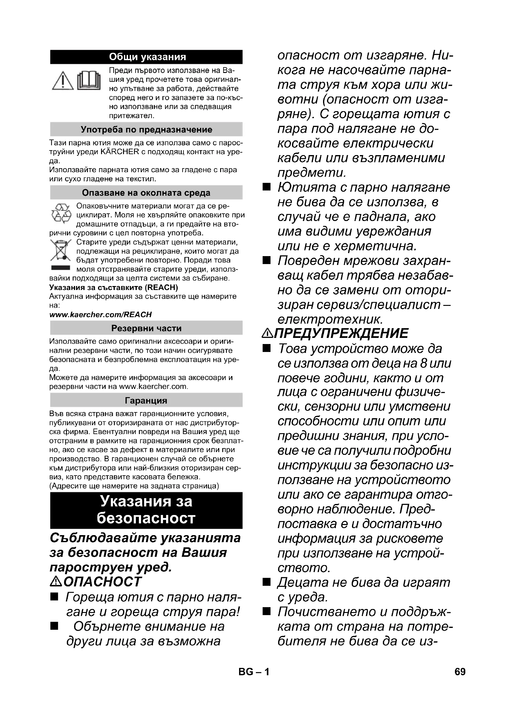 Ютията с парно налягане не бива да се използва, в случай че е паднала, ако има видими увреждания или не е херметична. Повреден мрежови захран- ващ кабел трябва незабав- но да се замени от отори- зиран сервиз/специалист – електротехник. 몇 ПРЕДУПРЕЖДЕНИЕ Това устройство може да се използва от деца на 8 или повече години, както и от лица с ограничени физиче- ски, сензорни или умствени способности или опит или предишни знания, при усло- вие че са получили подробни инструкции за безопасно из- ползване на устройството или ако се гарантира отго- ворно наблюдение. Пред- поставка е и достатъчно информация за рисковете при използване на устрой-
