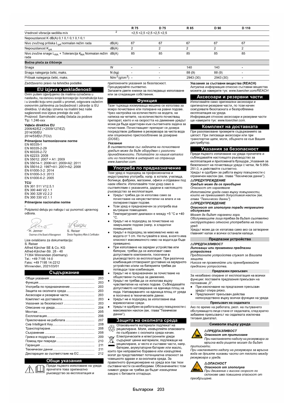 Подписващите лица действат от името и като пълномощници на управителния орган. Пълномощник по документацията: S. Reiser Alfred Kärcher SE & Co. KG Alfred-Kärcher-Str. 28 - 40 71364 Winnenden (Germany) Тел.: +49 7195 14-0 Факс: +49 7195 14-2212 Виненден, 2021/03/01 Работна ширина със странични метли mm 1080 1080 1080 1080 1080 Размери опаковка lxbxh B 150 (B 200) mm 1870x1120x1700 (2040x1120x1800) 1870x1120x1700 (2040x1120x1800) 1870x1120x1700 (2040x1120x1800) 1870x1120x1700 (2040x1120x1800) 1870x1120x1700 (2040x1120x1800)