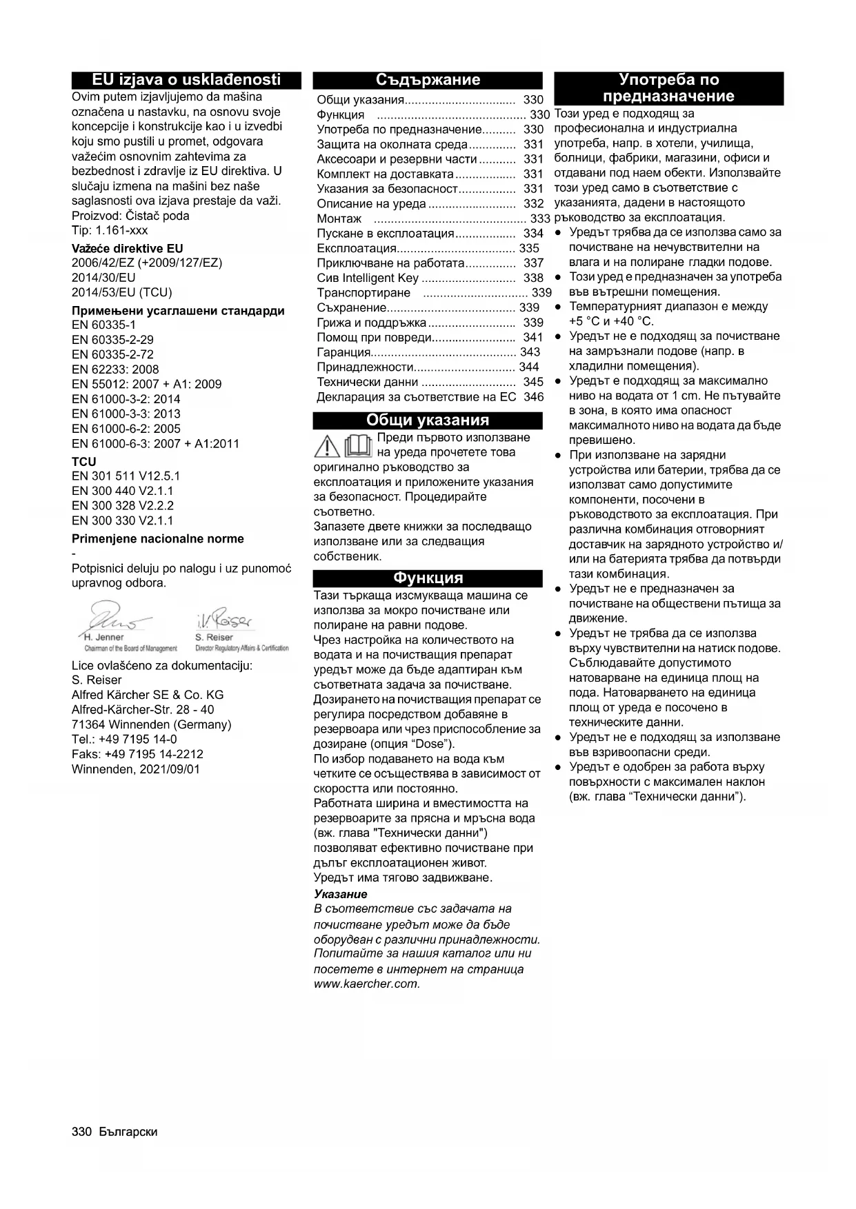 Принадлежности.............................. 344 Технически данни ............................ 345 Декларация за съответствие на ЕС 346Български 331 Защита на околната среда Опаковъчните материали подлежат на рециклиране. Моля, изхвърляйте опаковките по съобразен с околната среда начин. Електрическите и електронните уреди съдържат ценни материали, подлежащи на рециклиране, а често и съставни части, напр. батерии, акумулаторни батерии или масло, които при неправилно боравене или изхвърляне могат да представляват потенциална опасност за човешкото здраве и за околната среда. За правилното функциониране на уреда все пак тези съставни части са необходими. Обозначените с този символ уреди не трябва да бъдат изхвърляни заедно с битовите отпадъци. Указания за съставни вещества (REACH) Актуална информация относно съставни вещества можете да намерите тук: www.kaercher.com/REACH Аксесоари и резервни части Използвайте само оригинални аксесоари и оригинални резервни части, по този начин осигурявате безопасната и безпроблемна експлоатация на уреда. Информация относно аксесоари и резервни части ще намерите тук: www.kaercher.com. Комплект на доставката При разопаковане проверете съдържанието за цялост. При липсващи аксесоари или при транспортни щети, моля, обърнете се към Вашия дистрибутор. Указания за безопасност Преди първото използване на уреда прочетете и съблюдавайте настоящото ръководство за експлоатация и приложената брошура „Указания за безопасност на почистващи уреди с четки, № 5.956-251.0, и действайте