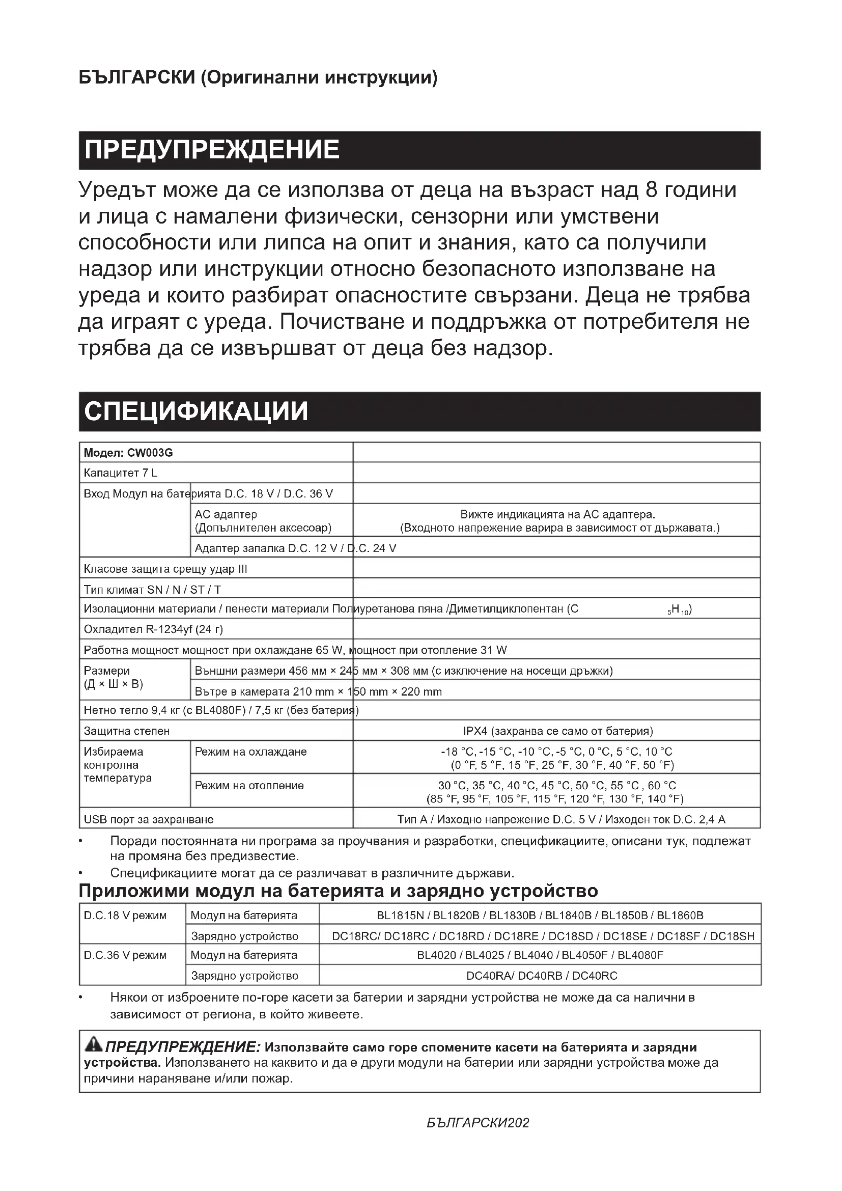 - Bateri dhe karikues origjinal Makita SHËNIM: Disa artikuj në listë mund të jenë të përfshirë në paketimin e veglës si aksesorë standardë. Këto mund të ndryshojnë nga një vend në tjetrin.БЪЛГАРСКИ202 БЪЛГАРСКИ (Оригинални инструкции) ПРЕДУПРЕЖДЕНИЕ Уредът може да се използва от деца на възраст над 8 години и лица с намалени физически, сензорни или умствени способности или липса на опит и знания, като са получили надзор или инструкции относно безопасното използване на уреда и които разбират опасностите свързани. Деца не трябва да играят с уреда. Почистване и поддръжка от потребителя не трябва да се извършват от деца без надзор. СПЕЦИФИКАЦИИ Модел: CW003GКапацитет 7 LВход Модул на батерията D.C. 18 V / D.C. 36 VAC адаптер (Допълнителен аксесоар)Вижте индикацията на AC адаптера. (Входното напрежение варира в зависимост от държавата.)Адаптер запалка D.C. 12 V / D.C. 24 VКласове защита срещу удар IIIТип климат SN / N / ST / TИзолационни материали / пенести материали Полиуретанова пяна /Диметилциклопентан (C