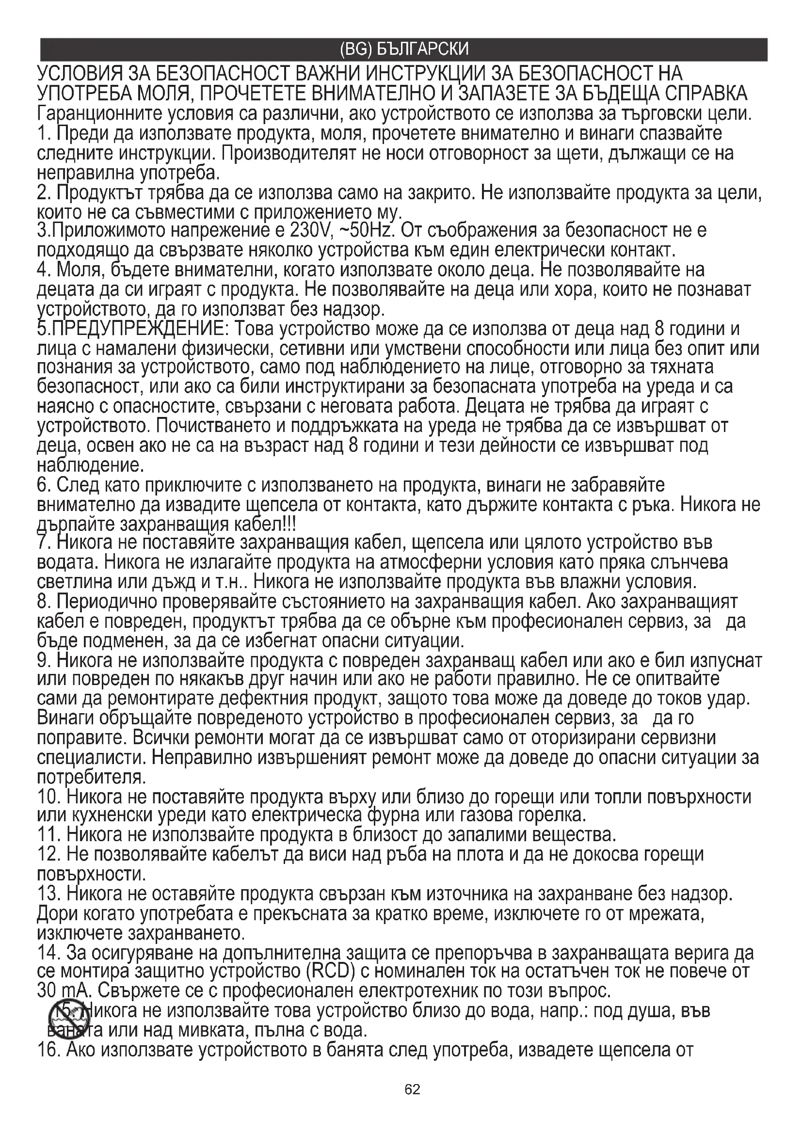 децата да си играят с продукта. Не позволявайте на деца или хора, които не познават устройството, да го използват без надзор. 5.ПРЕДУПРЕЖДЕНИЕ: Това устройство може да се използва от деца над 8 години и лица с намалени физически, сетивни или умствени способности или лица без опит или познания за устройството, само под наблюдението на лице, отговорно за тяхната безопасност, или ако са били инструктирани за безопасната употреба на уреда и са наясно с опасностите, свързани с неговата работа. Децата не трябва да играят с устройството. Почистването и поддръжката на уреда не трябва да се извършват от деца, освен ако не са на възраст над 8 години и тези дейности се извършват под наблюдение.