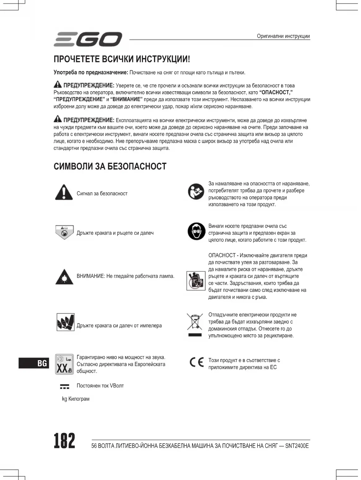 Гарантирано ниво на мощност на звука. Съгласно директивата на Европейската общност.Този продукт е в съответствие с приложимите директива на ЕСПостоянен ток V Волтkg КилограмОригинални инструкции56 ВОЛТА ЛИТИЕВО-ЙОННА БЕЗКАБЕЛНА МАШИНА ЗА ПОЧИСТВАНЕ НА СНЯГ — SNT2400E