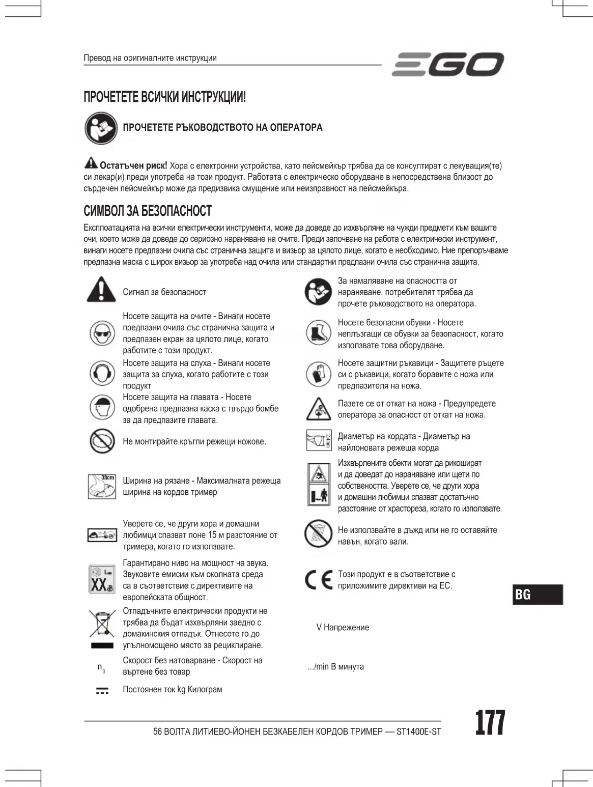 ГАРАНЦИОННА ПОЛИТИКА EGO Моля, посетете уебсайта egopowerplus.com за пълните срокове и условия по гаранционната политика на EGO.56-VOLTNI LITIJ-IONSKI BATERIJSKI ŠIŠAČ S REZNOM NITI — ST1400E-ST184