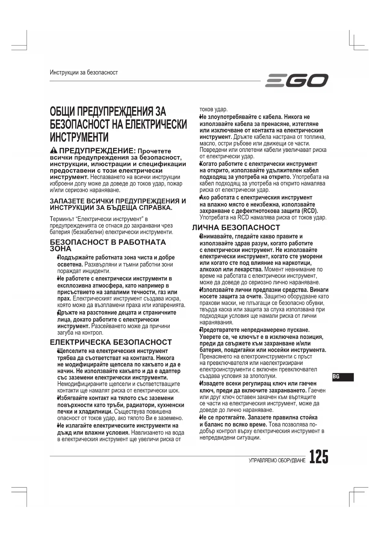 Ако настъпят събития, които не са засегнати в това ръководство, бъдете предпазливи и използвайте добра преценка. Свържете се с обслужване на клиенти на EGO за помощ.