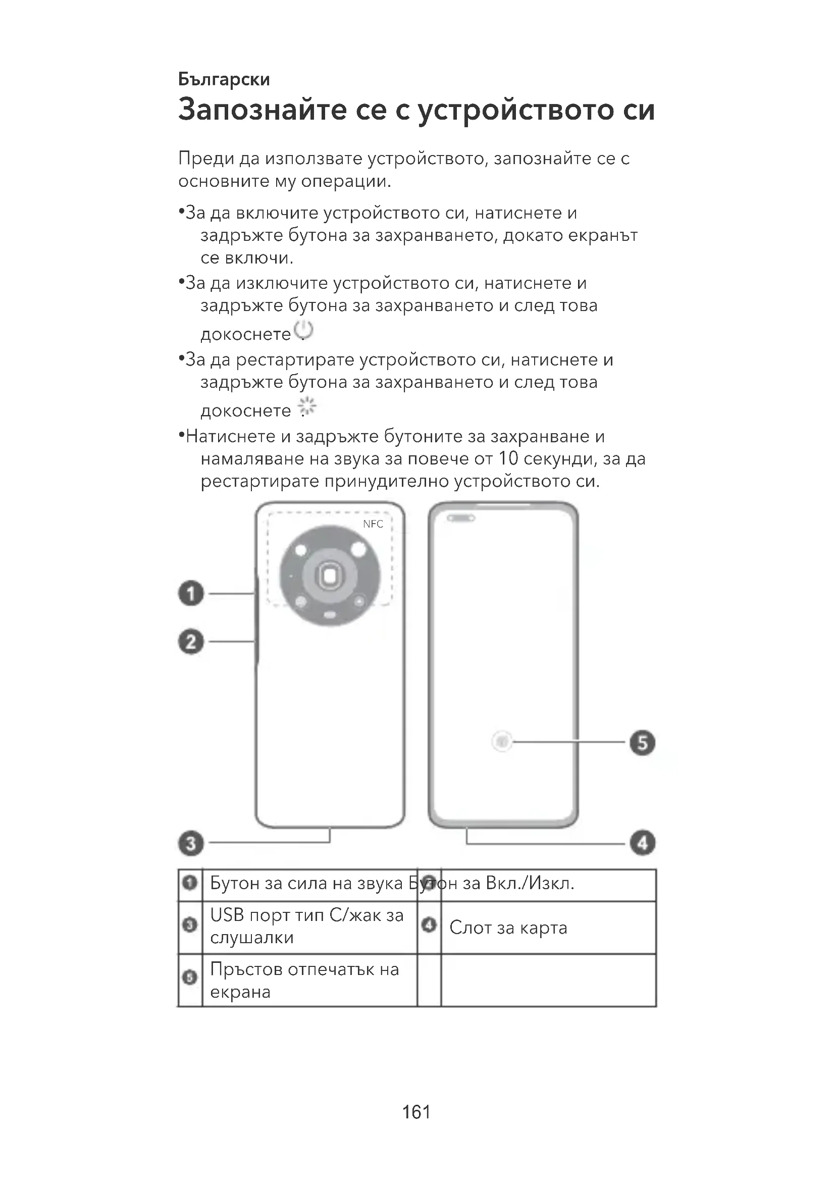- Натиснете и задръжте бутоните за захранване и намаляване на звука за повече от 10 секунди, за да рестартирате принудително устройството си. NFC Бутон за сила на звука Бутон за Вкл./Изкл. USB порт тип C/жак за