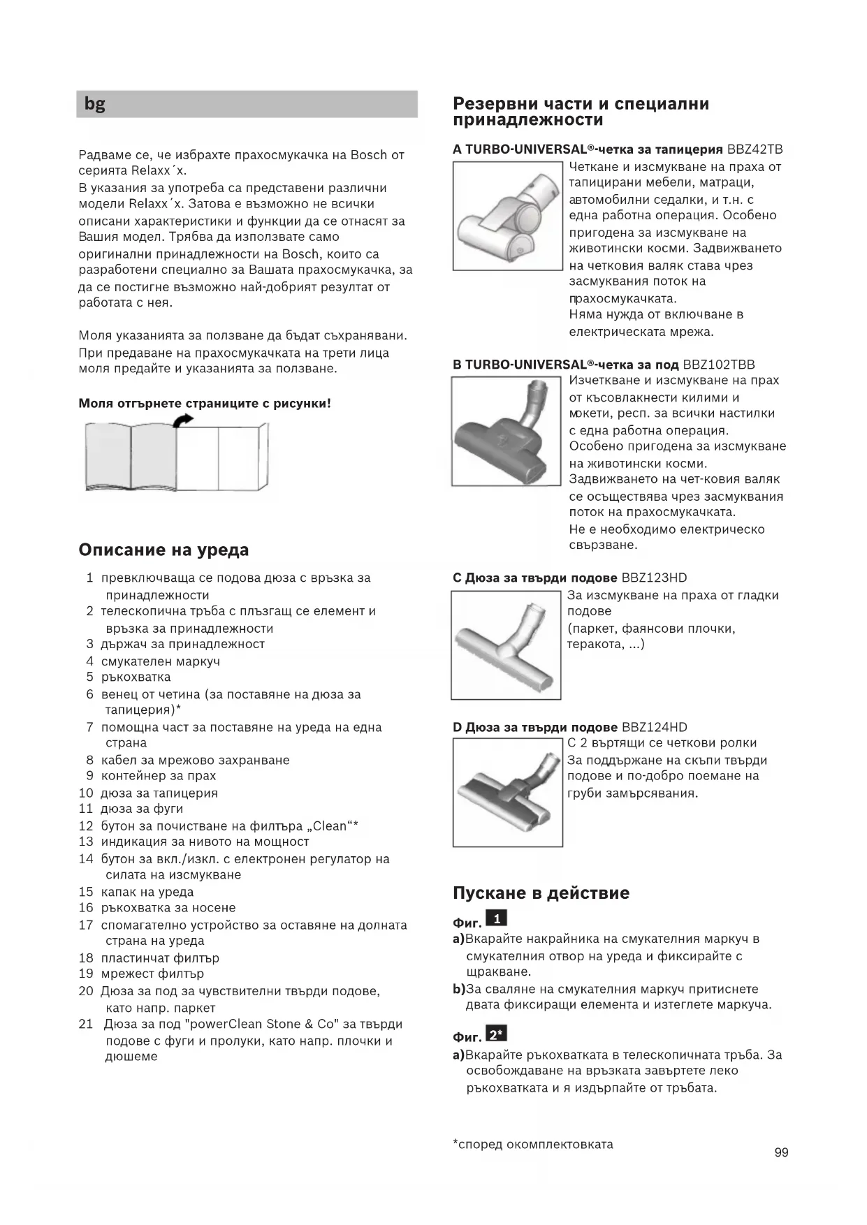 оля указанията за ползване да бъдат съхранявани. При предаване на прахосмукачката на трети лица моля предайте и указанията за ползване. Моля отгърнете страниците с рисунки! Описание на уреда 1 превключваща се подова дюза с връзка за принадлежности 2 телескопична тръба с плъзгащ се елемент и връзка за принадлежности 3 държач за принадлежност 4 смукателен маркуч 5 ръкохватка 6 венец от четина (за поставяне на дюза за тапицерия)* 7 помощна част за поставяне на уреда на една