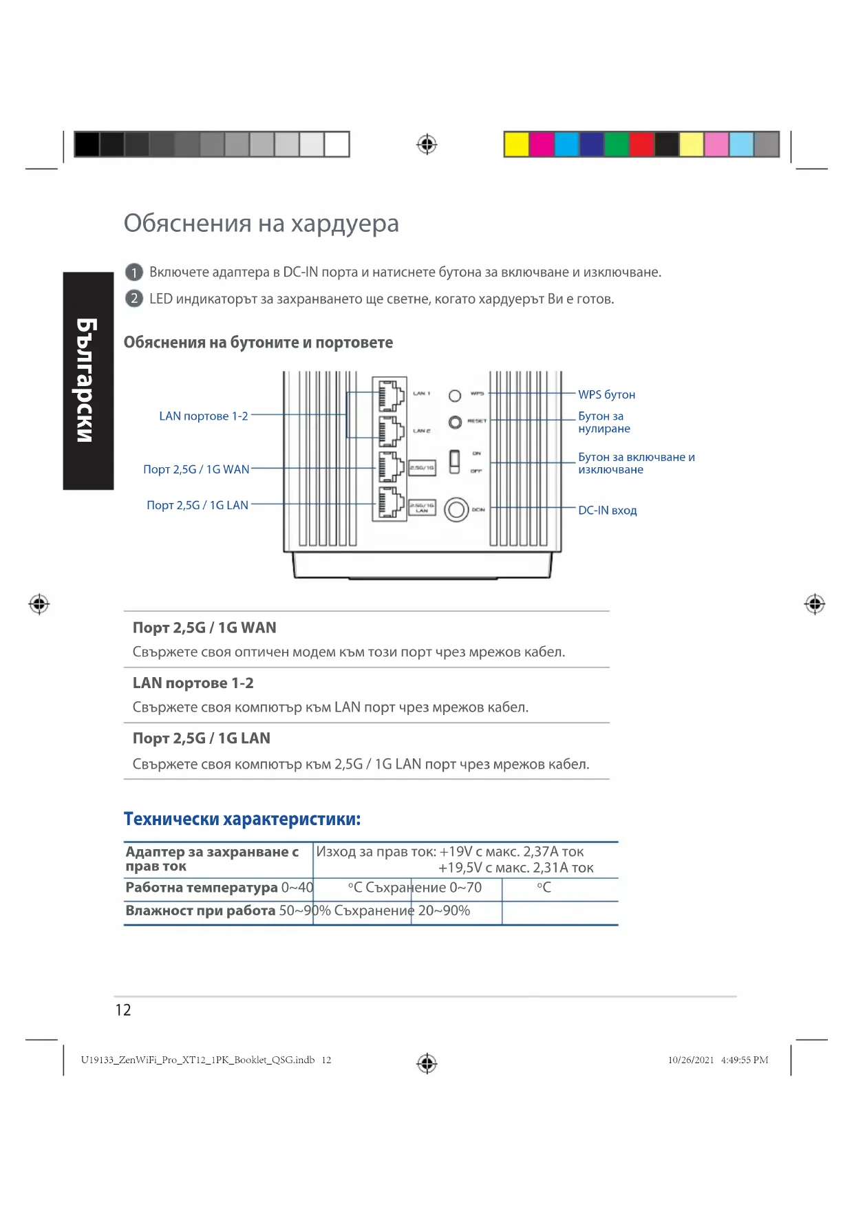 Включете адаптера в DC-IN порта и натиснете бутона за включване и изключване. LED индикаторът за захранването ще светне, когато хардуерът Ви е готов. Обяснения на бутоните и портовете Порт 2,5G / 1G WAN Свържете своя оптичен модем към този порт чрез мрежов кабел. LAN портове 1-2 Свържете своя компютър към LAN порт чрез мрежов кабел. Порт 2,5G / 1G LAN Свържете своя компютър към 2,5G / 1G LAN порт чрез мрежов кабел.Адаптер за захранване с прав токИзход за прав ток: +19V с макс. 2,37A ток +19,5V с макс. 2,31A токРаботна температура 0~40 C Съхранение 0~70
