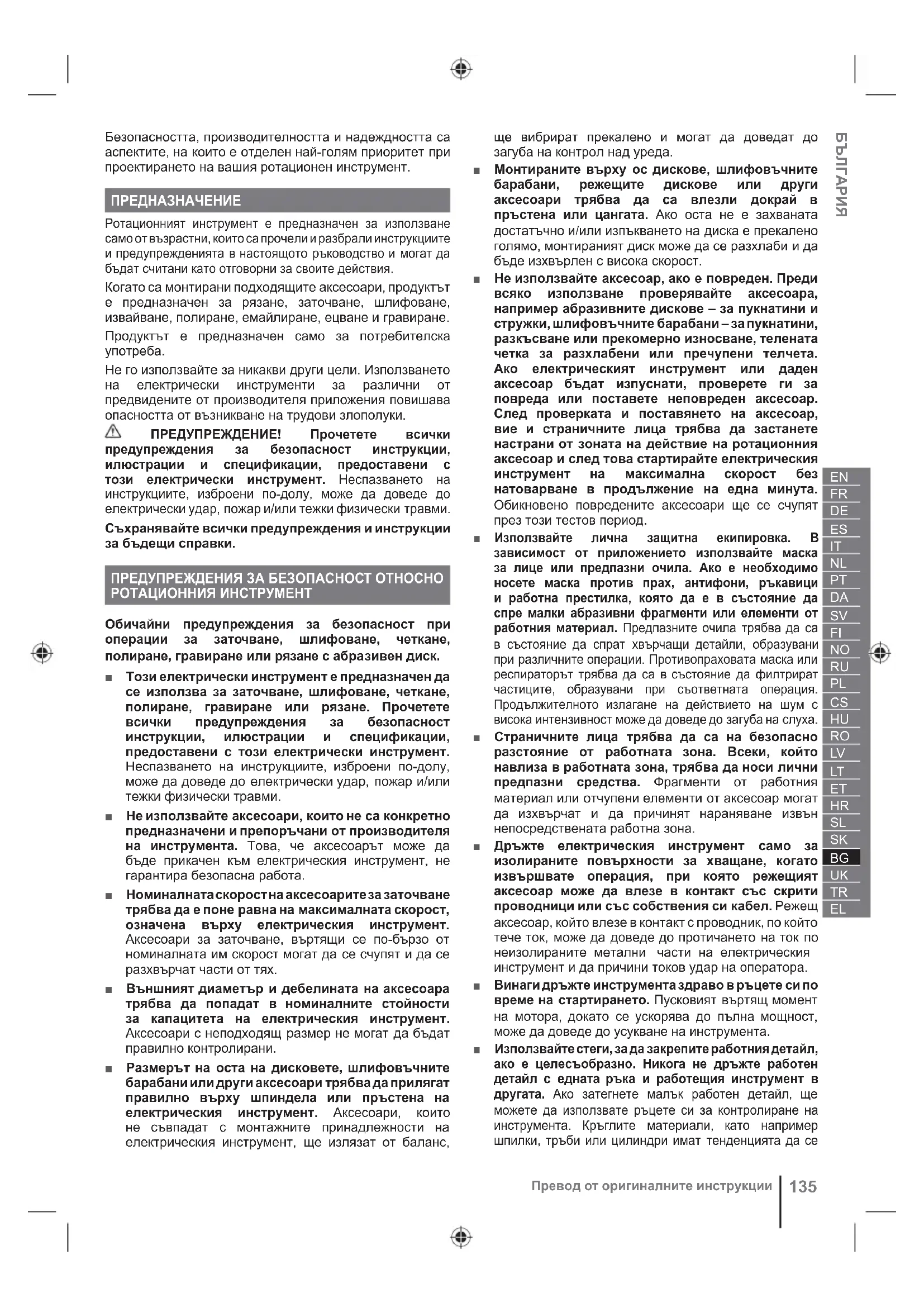 Preklad originálnych pokynovБезопасността, производителността и надеждността са аспектите, на които е отделен най-голям приоритет при проектирането на вашия ротационен инструмент. ПРЕДНАЗНАЧЕНИЕ Ротационният инструмент е предназначен за използване само от възрастни, които са прочели и разбрали инструкциите и предупрежденията в настоящото ръководство и могат да бъдат считани като отговорни за своите действия. Когато са монтирани подходящите аксесоари, продуктът е предназначен за рязане, заточване, шлифоване, извайване, полиране, емайлиране, ецване и гравиране. Продуктът е предназначен само за потребителска