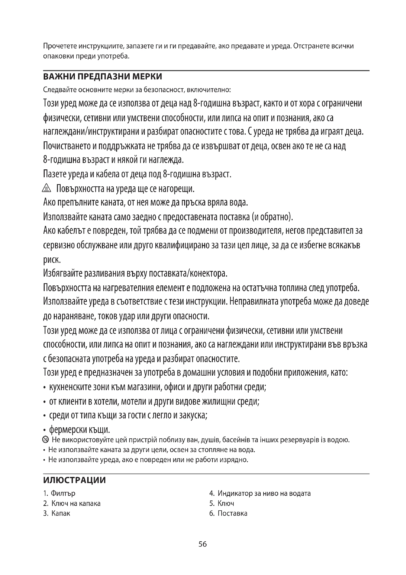 AE56 Прочетете инструкциите, запазете ги и ги предавайте, ако предавате и уреда. Отстранете всички опаковки преди употреба. ВАЖНИ ПРЕДПАЗНИ МЕРКИ Следвайте основните мерки за безопасност, включително: Този уред може да се използва от деца над 8-годишна възраст, както и от хора с ограничени физически, сетивни или умствени способности, или липса на опит и познания, ако са наглеждани/инструктирани и разбират опасностите с това. С уреда не трябва да играят деца. Почистването и поддръжката не трябва да се извършват от деца, освен ако те не са над 8-годишна възраст и някой ги наглежда. Пазете уреда и кабела от деца под 8-годишна възраст. h Повърхността на уреда ще се нагорещи. Ако препълните каната, от нея може да пръска вряла вода. Използвайте каната само заедно с предоставената поставка (и обратно). Ако кабелът е повреден, той трябва да се подмени от производителя, негов представител за сервизно обслужване или друго квалифицирано за тази цел лице, за да се избегне всякакъв