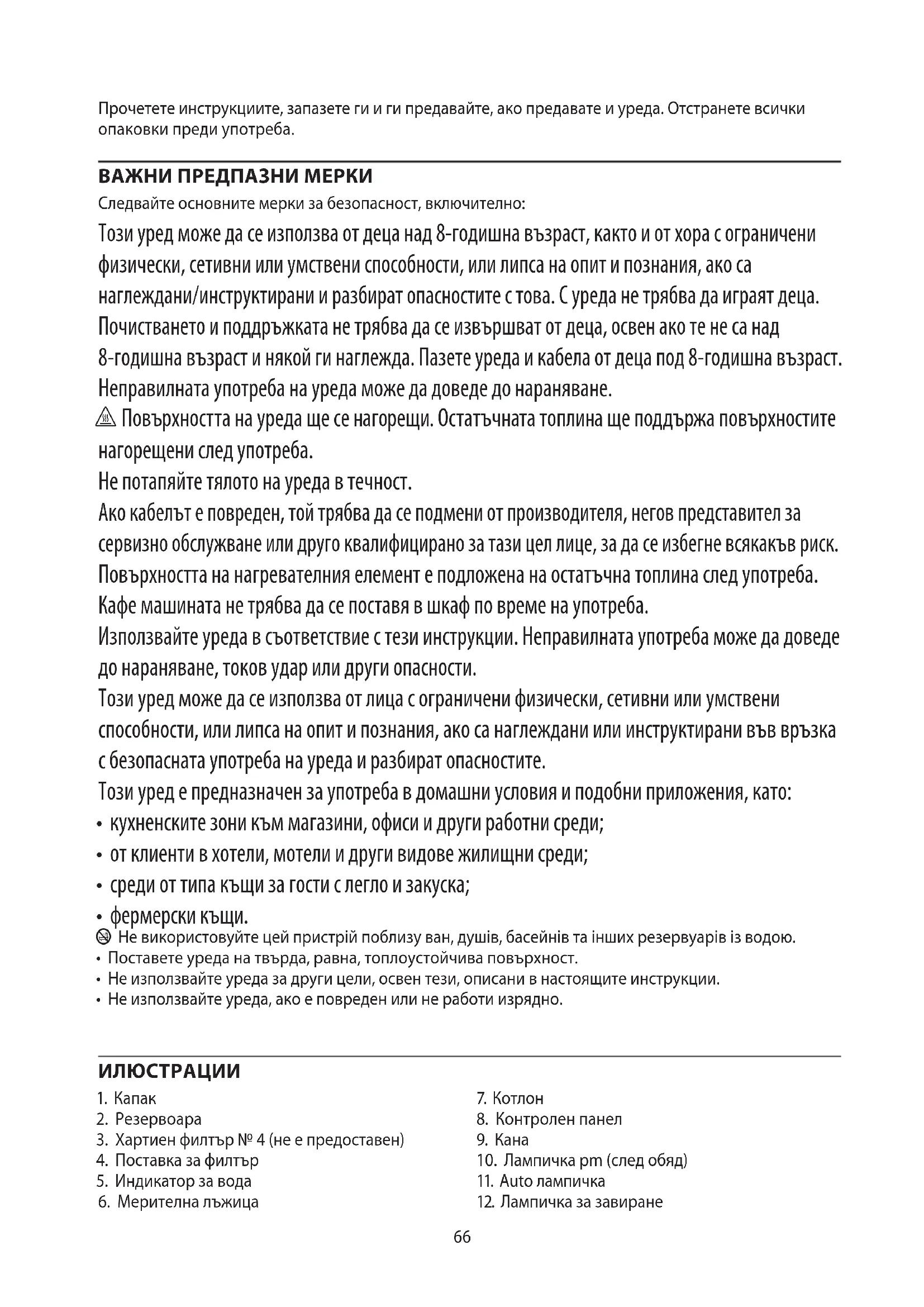 AE66 Прочетете инструкциите, запазете ги и ги предавайте, ако предавате и уреда. Отстранете всички опаковки преди употреба. ВАЖНИ ПРЕДПАЗНИ МЕРКИ Следвайте основните мерки за безопасност, включително: Този уред може да се използва от деца над 8-годишна възраст, както и от хора с ограничени физически, сетивни или умствени способности, или липса на опит и познания, ако са наглеждани/инструктирани и разбират опасностите с това. С уреда не трябва да играят деца. Почистването и поддръжката не трябва да се извършват от деца, освен ако те не са над 8-годишна възраст и някой ги наглежда. Пазете уреда и кабела от деца под 8-годишна възраст. Неправилната употреба на уреда може да доведе до нараняване. h Повърхността на уреда ще се нагорещи. Остатъчната топлина ще поддържа повърхностите нагорещени след употреба. Не потапяйте тялото на уреда в течност. Ако кабелът е повреден, той трябва да се подмени от производителя, негов представител за сервизно обслужване или друго квалифицирано за тази цел лице, за да се избегне всякакъв риск. Повърхността на нагревателния елемент е подложена на остатъчна топлина след употреба. Кафе машината не трябва да се поставя в шкаф по време на употреба. Използвайте уреда в съответствие с тези инструкции. Неправилната употреба може да доведе до нараняване, токов удар или други опасности. Този уред може да се използва от лица с ограничени физически, сетивни или умствени способности, или липса на опит и познания, ако са наглеждани или инструктирани във връзка с безопасната употреба на уреда и разбират опасностите. Този уред е предназначен за употреба в домашни условия и подобни приложения, като: