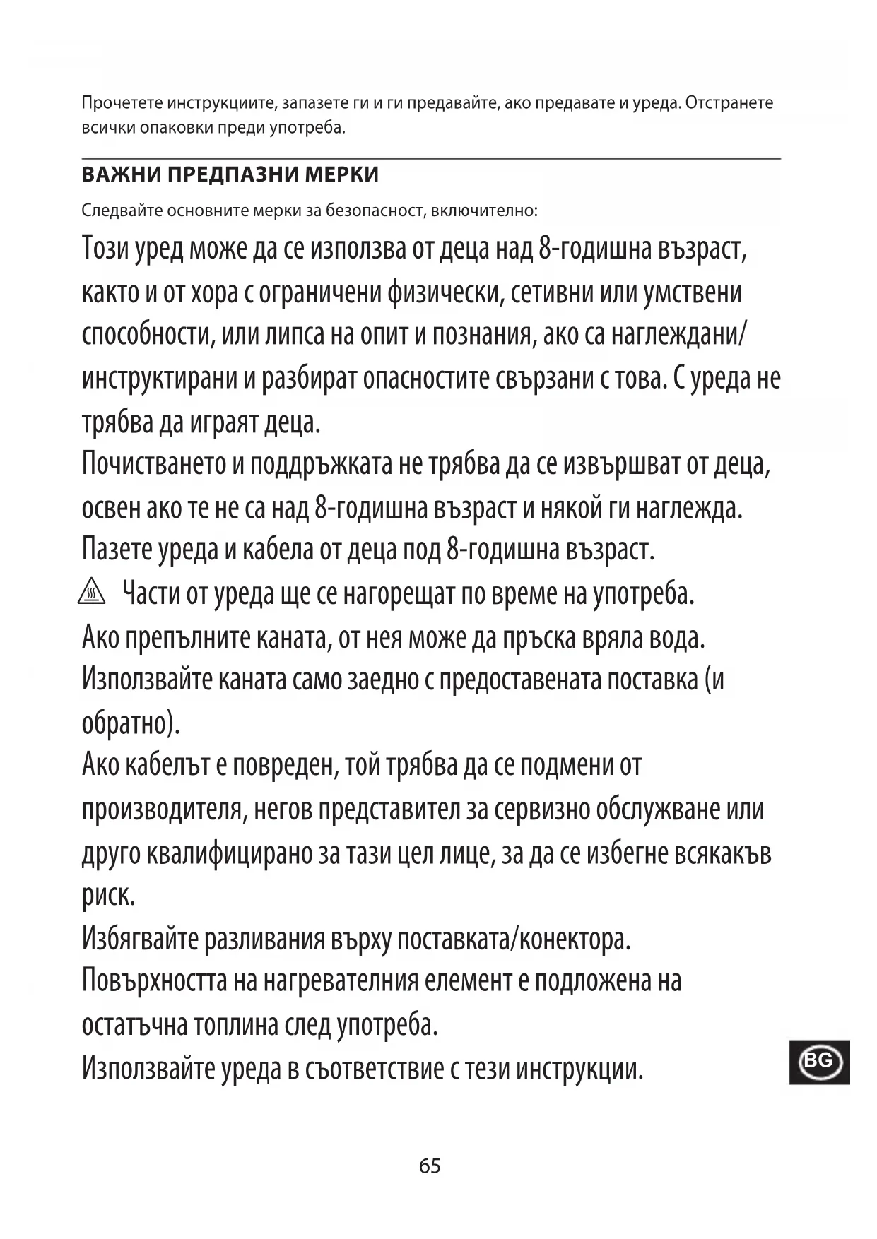 Pentru a evita problemele de mediu și de sănătate cauzate de substanțele periculoase, aparatele și bateriile reîncărcabile și cele obișnuite marcate cu unul dintre aceste simboluri, nu trebuie eliminate împreună cu deșeurile municipale nesortate. Eliminați întotdeauna produsele electrice și electronice și, după caz, bateriile reîncărcabile și cele obișnuite, la un punct de reciclare/colectare corespunzător.65 Прочетете инструкциите, запазете ги и ги предавайте, ако предавате и уреда. Отстранете всички опаковки преди употреба. ВАЖНИ ПРЕДПАЗНИ МЕРКИ Следвайте основните мерки за безопасност, включително: Този уред може да се използва от деца над 8-годишна възраст, както и от хора с ограничени физически, сетивни или умствени способности, или липса на опит и познания, ако са наглеждани/ инструктирани и разбират опасностите свързани с това. С уреда не трябва да играят деца. Почистването и поддръжката не трябва да се извършват от деца, освен ако те не са над 8-годишна възраст и някой ги наглежда. Пазете уреда и кабела от деца под 8-годишна възраст. h Части от уреда ще се нагорещат по време на употреба. Ако препълните каната, от нея може да пръска вряла вода. Използвайте каната само заедно с предоставената поставка (и