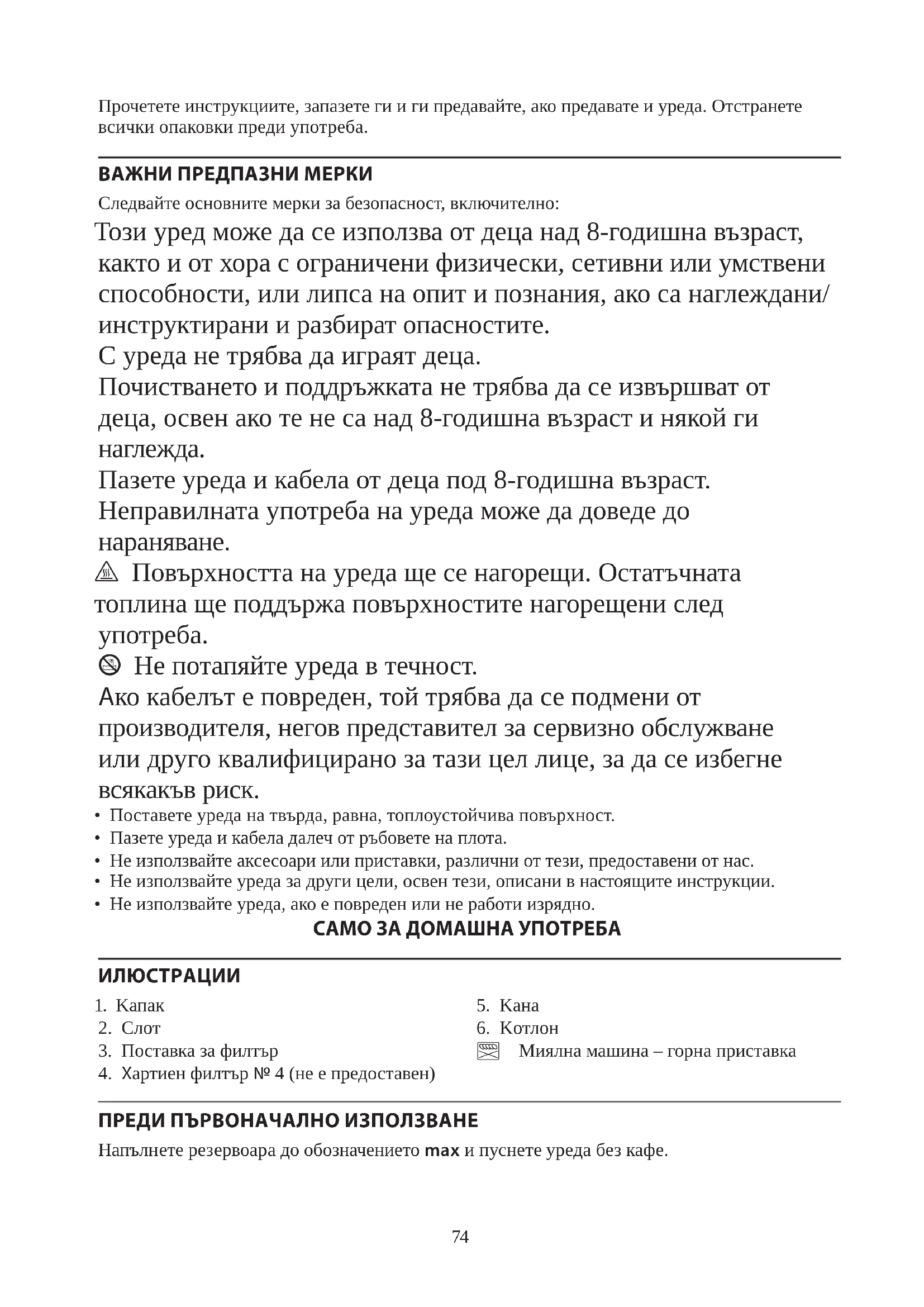 AE74 Прочетете инструкциите, запазете ги и ги предавайте, ако предавате и уреда. Отстранете всички опаковки преди употреба. ВАЖНИ ПРЕДПАЗНИ МЕРКИ Следвайте основните мерки за безопасност, включително: Този уред може да се използва от деца над 8-годишна възраст, както и от хора с ограничени физически, сетивни или умствени способности, или липса на опит и познания, ако са наглеждани/ инструктирани и разбират опасностите. С уреда не трябва да играят деца. Почистването и поддръжката не трябва да се извършват от деца, освен ако те не са над 8-годишна възраст и някой ги