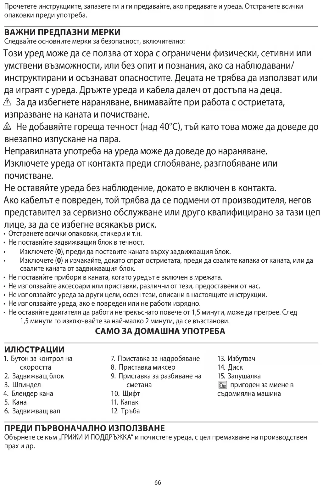 AE66 Прочетете инструкциите, запазете ги и ги предавайте, ако предавате и уреда. Отстранете всички опаковки преди употреба. ВАЖНИ ПРЕДПАЗНИ МЕРКИ Следвайте основните мерки за безопасност, включително: Този уред може да се ползва от хора с ограничени физически, сетивни или умствени възможности, или без опит и познания, ако са наблюдавани/ инструктирани и осъзнават опасностите. Децата не трябва да използват или да играят с уреда. Дръжте уреда и кабела далеч от достъпа на деца. c За да избегнете нараняване, внимавайте при работа с остриетата, изпразване на каната и почистване. h Не добавяйте гореща течност (над 40°C), тъй като това може да доведе до внезапно изпускане на пара. Неправилната употреба на уреда може да доведе до нараняване. Изключете уреда от контакта преди сглобяване, разглобяване или почистване. Не оставяйте уреда без наблюдение, докато е включен в контакта. Ако кабелът е повреден, той трябва да се подмени от производителя, негов представител за сервизно обслужване или друго квалифицирано за тази цел лице, за да се избегне всякакъв риск.