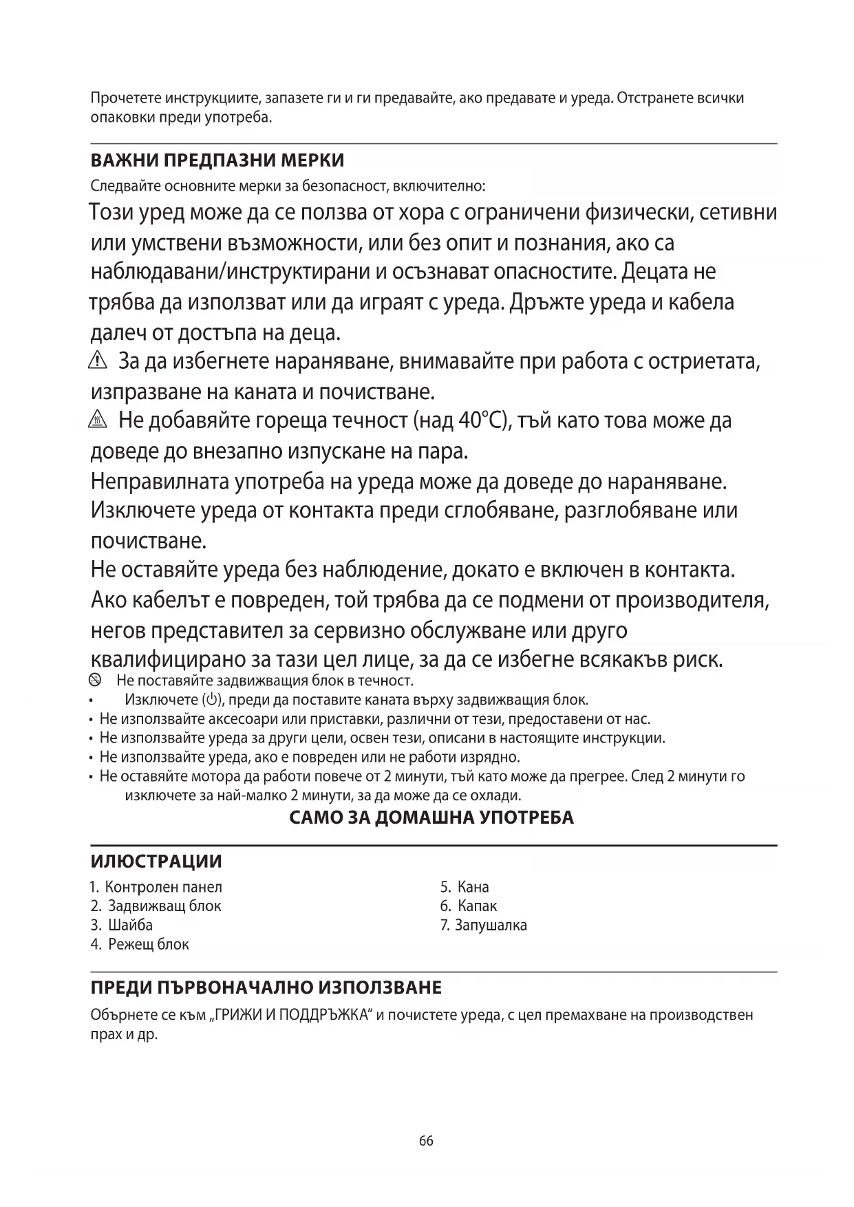 AE66 Прочетете инструкциите, запазете ги и ги предавайте, ако предавате и уреда. Отстранете всички опаковки преди употреба. ВАЖНИ ПРЕДПАЗНИ МЕРКИ Следвайте основните мерки за безопасност, включително: Този уред може да се ползва от хора с ограничени физически, сетивни или умствени възможности, или без опит и познания, ако са наблюдавани/инструктирани и осъзнават опасностите. Децата не трябва да използват или да играят с уреда. Дръжте уреда и кабела далеч от достъпа на деца. c За да избегнете нараняване, внимавайте при работа с остриетата, изпразване на каната и почистване. h Не добавяйте гореща течност (над 40°C), тъй като това може да доведе до внезапно изпускане на пара. Неправилната употреба на уреда може да доведе до нараняване. Изключете уреда от контакта преди сглобяване, разглобяване или почистване. Не оставяйте уреда без наблюдение, докато е включен в контакта. Ако кабелът е повреден, той трябва да се подмени от производителя, негов представител за сервизно обслужване или друго квалифицирано за тази цел лице, за да се избегне всякакъв риск. l Не поставяйте задвижващия блок в течност.