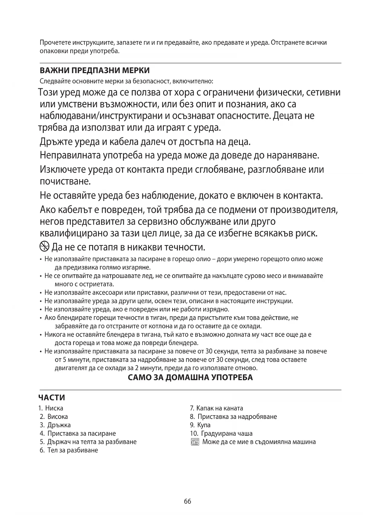 AE66 Прочетете инструкциите, запазете ги и ги предавайте, ако предавате и уреда. Отстранете всички опаковки преди употреба. ВАЖНИ ПРЕДПАЗНИ МЕРКИ Следвайте основните мерки за безопасност, включително: Този уред може да се ползва от хора с ограничени физически, сетивни или умствени възможности, или без опит и познания, ако са наблюдавани/инструктирани и осъзнават опасностите. Децата не трябва да използват или да играят с уреда. Дръжте уреда и кабела далеч от достъпа на деца. Неправилната употреба на уреда може да доведе до нараняване. Изключете уреда от контакта преди сглобяване, разглобяване или почистване. Не оставяйте уреда без наблюдение, докато е включен в контакта. Ако кабелът е повреден, той трябва да се подмени от производителя, негов представител за сервизно обслужване или друго квалифицирано за тази цел лице, за да се избегне всякакъв риск. i Да не се потапя в никакви течности.