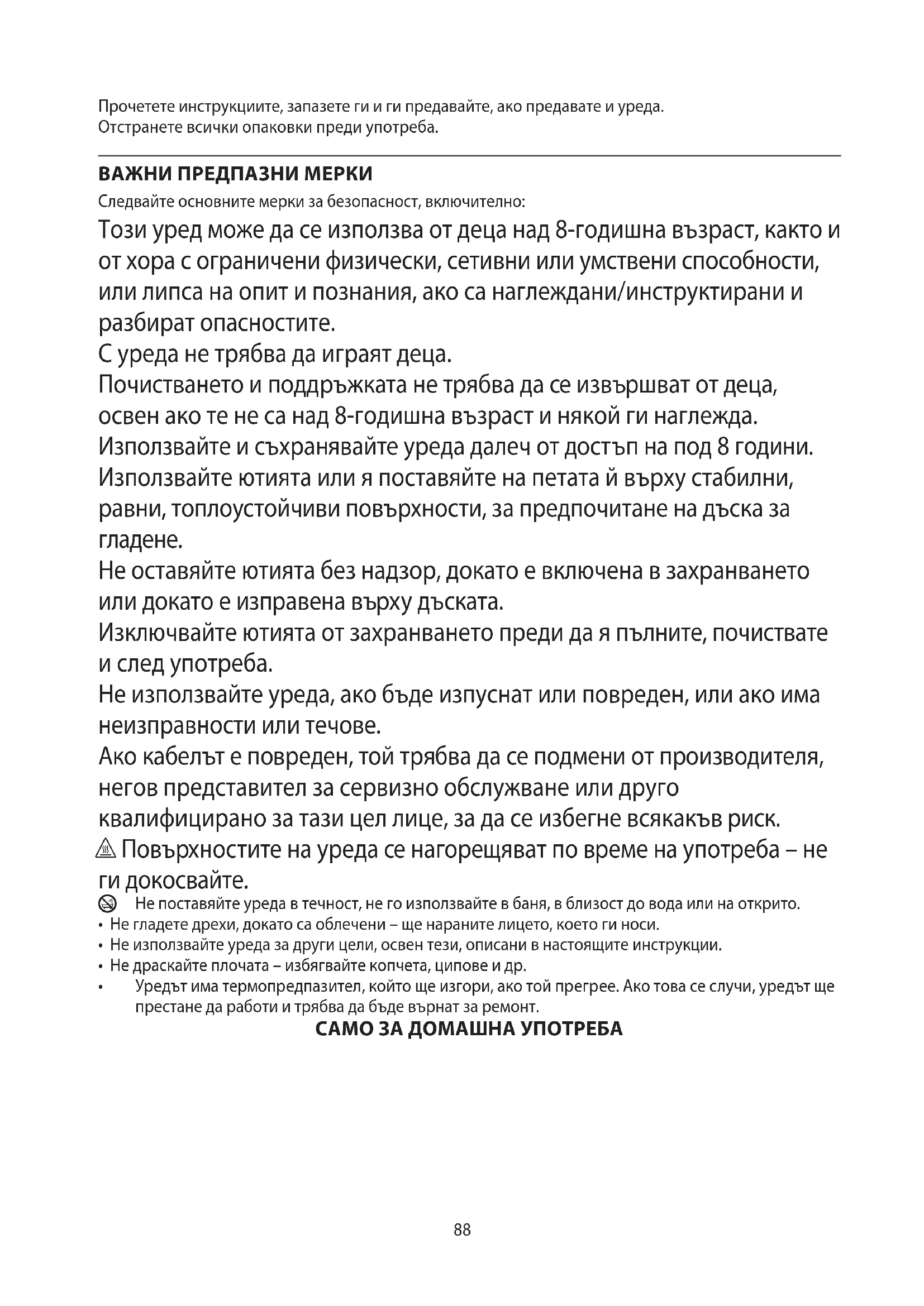 - Уредът има термопредпазител, който ще изгори, ако той прегрее. Ако това се случи, уредът ще престане да работи и трябва да бъде върнат за ремонт. САМО ЗА ДОМАШНА УПОТРЕБА89