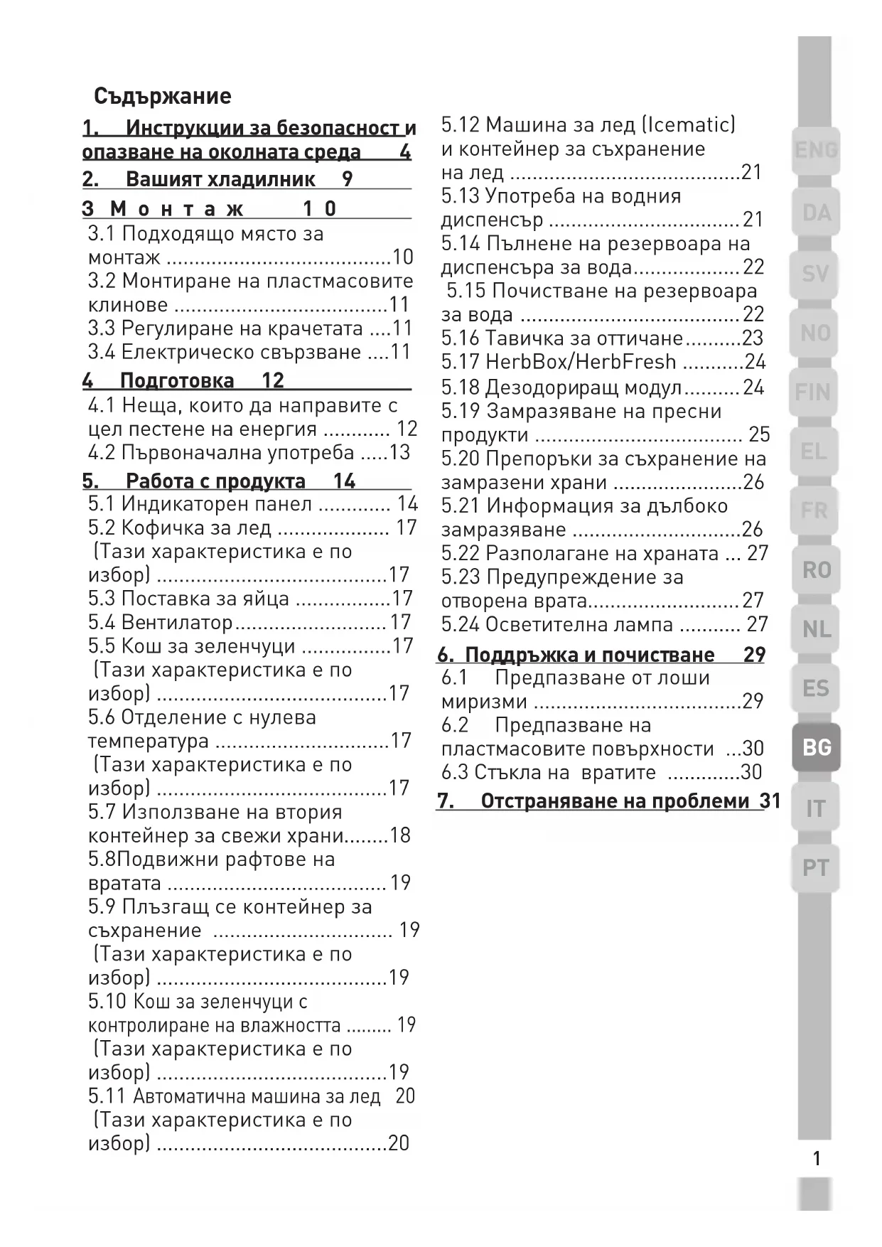 Минималната продължителност на гаранцията на закупения от вас хладилник е 24 месеца. Този продукт е оборудван с източник на осветление от енергиен клас „G“. Източникът на осветление в този продукт може да бъде заменен само от професионални сервизни техници.1