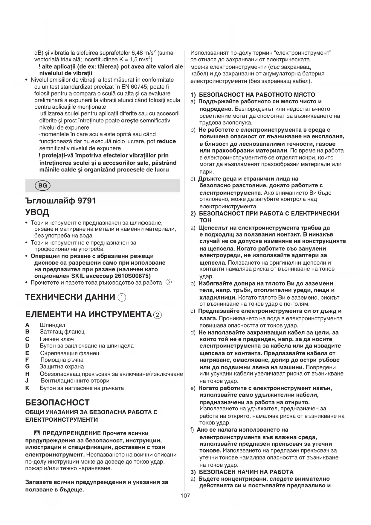 A Шпиндел B Затягащ фланец C Гаечен ключ D Бутон за заключване на шпиндела E Скрепяващия фланец F Помощна ръчка G Защитна охрана H Обезопасяващ прекъсвач за включване/изключване J Вентилационните отвоpи K Бутон за нагласяне на ръчката БЕЗОПАСНОСТ ОБЩИ УКАЗАНИЯ ЗА БЕЗОПАСНА РАБОТА С ЕЛЕКТРОИНСТРУМЕНТИ - ПРЕДУПРЕЖДЕНИЕ Прочете всички предупреждения за безопасност, инструкции, илюстрации и спецификации, доставени с този електроинструмент. Неспазването на всички описани по-долу инструкции може да доведе до токов удар, пожар и/или тежко нараняване. Запазете всички предупреждения и указания за ползване в бъдеще.108 който не може да бъде изключван и включван по предвидения от производителя начин, е опасен и трябва да бъде ремонтиран. c) Преди да извършвате каквито и да е дейности по електроинструмента, напр. настройване, смяна на работен инструмент, както и когато го прибирате, изключвайте щепсела от контакта, респ. изваждайте батерията, ако е възможно. Тази мярка премахва опасността от задействане на електроинструмента по невнимание. d) Съхранявайте електроинструментите на места, където не могат да бъдат достигнати от деца. Не допускайте те да бъдат използвани от лица, които не са запознати с начина на работа с тях и не са прочели тези инструкции. Когато са в ръцете на неопитни потребители, електроинструментите могат да бъдат изключително опасни. e) Поддържайте добре електроинструментите си и аксесоарите им. Проверявайте дали подвижните звена функционират безукорно, дали не заклинват, дали има счупени или повредени детайли, които нарушават или изменят функциите на електроинструмента. Преди да използвате електроинструмента, се погрижете повредените детайли да бъдат ремонтирани. Много от трудовите злополуки се дължат на недобре поддържани електроинструменти и уреди. f) Поддържайте режещите инструменти винаги добре заточени и чисти. Добре поддържаните режещи инструменти с остри ръбове оказват по- малко съпротивление и се водят по-леко. g) Използвайте електроинструментите, допълнителните приспособления, работните инструменти и т.н., съобразно инструкциите на производителя. С дейности и процедури, евентуално предписани от различни нормативни документи. Използването на електроинструменти за различни от предвидените от производителя приложения повишава опасността от възникване на трудови злополуки. h) Поддържайте дръжките и ръкохватките сухи, чисти и неомаслени. Хлъзгавите дръжки и ръкохватки не позволяват безопасната работа и доброто контролиране на електроинструмента при възникване на неочаквана ситуация.