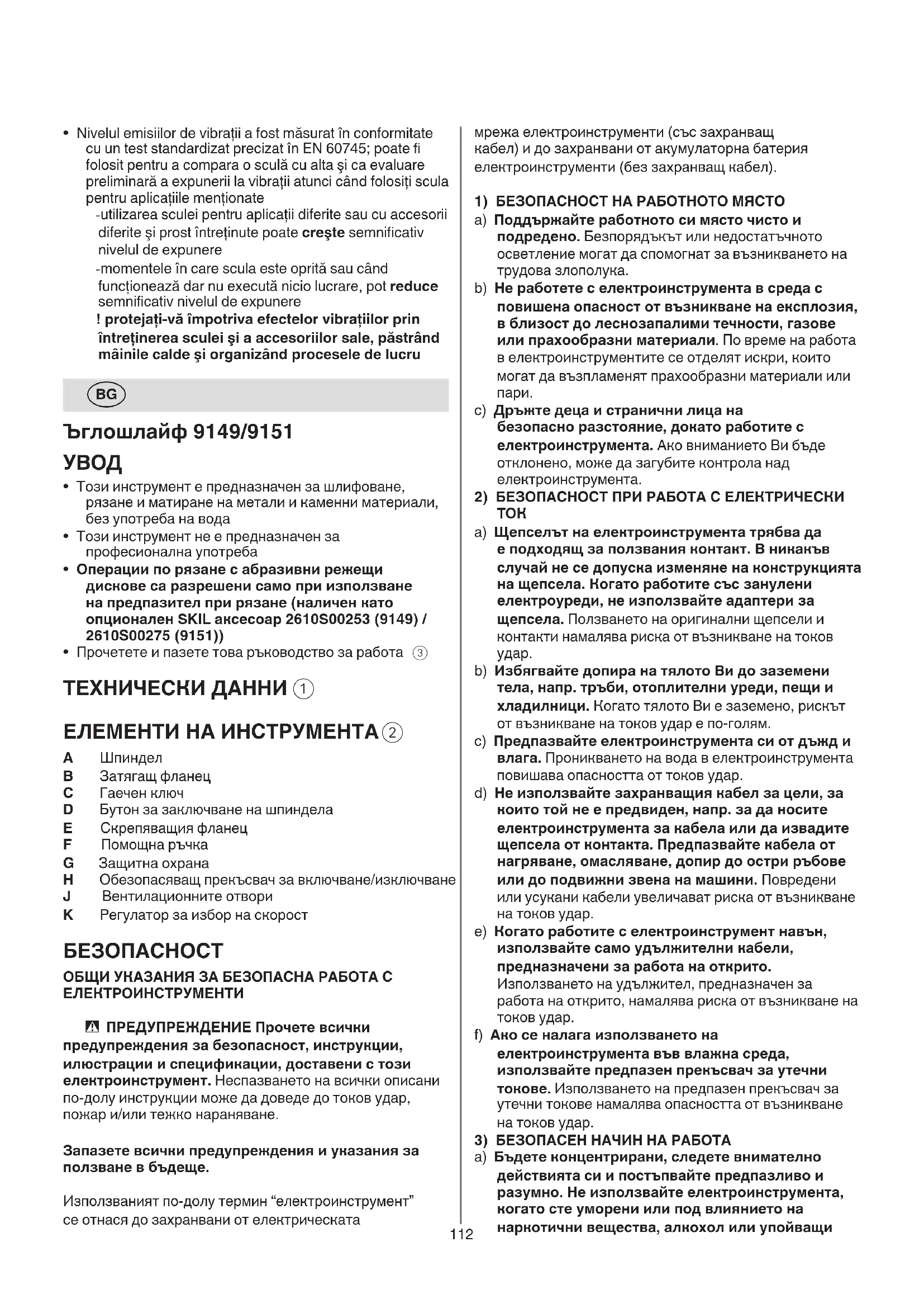 A Шпиндел B Затягащ фланец C Гаечен ключ D Бутон за заключване на шпиндела E Скрепяващия фланец F Помощна ръчка G Защитна охрана H Обезопасяващ прекъсвач за включване/изключване J Вентилационните отвоpи K Регулатор за избор на скорост БЕЗОПАСНОСТ ОБЩИ УКАЗАНИЯ ЗА БЕЗОПАСНА РАБОТА С ЕЛЕКТРОИНСТРУМЕНТИ - ПРЕДУПРЕЖДЕНИЕ Прочете всички предупреждения за безопасност, инструкции, илюстрации и спецификации, доставени с този електроинструмент. Неспазването на всички описани по-долу инструкции може да доведе до токов удар, пожар и/или тежко нараняване. Запазете всички предупреждения и указания за ползване в бъдеще. Използваният по-долу термин “електроинструмент” се отнася до захранвани от електрическата113 c) Преди да извършвате каквито и да е дейности по електроинструмента, напр. настройване, смяна на работен инструмент, както и когато го прибирате, изключвайте щепсела от контакта, респ. изваждайте батерията, ако е възможно. Тази мярка премахва опасността от задействане на електроинструмента по невнимание. d) Съхранявайте електроинструментите на места, където не могат да бъдат достигнати от деца. Не допускайте те да бъдат използвани от лица, които не са запознати с начина на работа с тях и не са прочели тези инструкции. Когато са в ръцете на неопитни потребители, електроинструментите могат да бъдат изключително опасни. e) Поддържайте добре електроинструментите си и аксесоарите им. Проверявайте дали подвижните звена функционират безукорно, дали не заклинват, дали има счупени или повредени детайли, които нарушават или изменят функциите на електроинструмента. Преди да използвате електроинструмента, се погрижете повредените детайли да бъдат ремонтирани. Много от трудовите злополуки се дължат на недобре поддържани електроинструменти и уреди. f) Поддържайте режещите инструменти винаги добре заточени и чисти. Добре поддържаните режещи инструменти с остри ръбове оказват по- малко съпротивление и се водят по-леко. g) Използвайте електроинструментите, допълнителните приспособления, работните инструменти и т.н., съобразно инструкциите на производителя. С дейности и процедури, евентуално предписани от различни нормативни документи. Използването на електроинструменти за различни от предвидените от производителя приложения повишава опасността от възникване на трудови злополуки. h) Поддържайте дръжките и ръкохватките сухи, чисти и неомаслени. Хлъзгавите дръжки и ръкохватки не позволяват безопасната работа и доброто контролиране на електроинструмента при възникване на неочаквана ситуация.