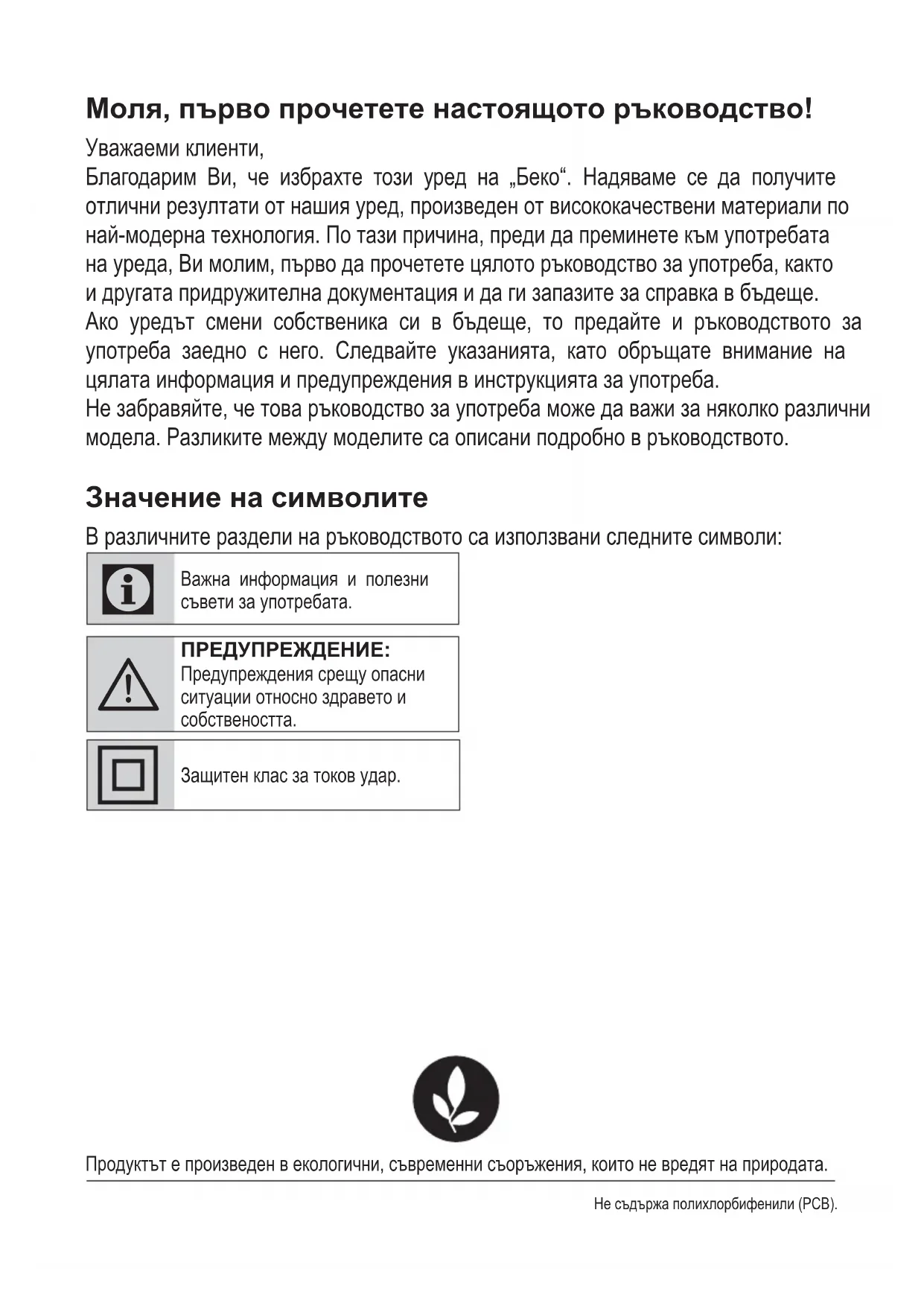 ПРЕДУПРЕЖДЕНИЕ: Предупреждения срещу опасни ситуации относно здравето и собствеността. Защитен клас за токов удар. Продуктът е произведен в екологични, съвременни съоръжения, които не вредят на природата. Не съдържа полихлорбифенили (РСВ).Прахосмукачка / Ръководство за употреба 23 / BG Този раздел съдържа инструк- ции за безопасност, които ще ви помогнат да се защитите от риск от нараняване или мате- риална повреда. Неспазването на инструкциите води до отмяна на предоставе- ната гаранция.