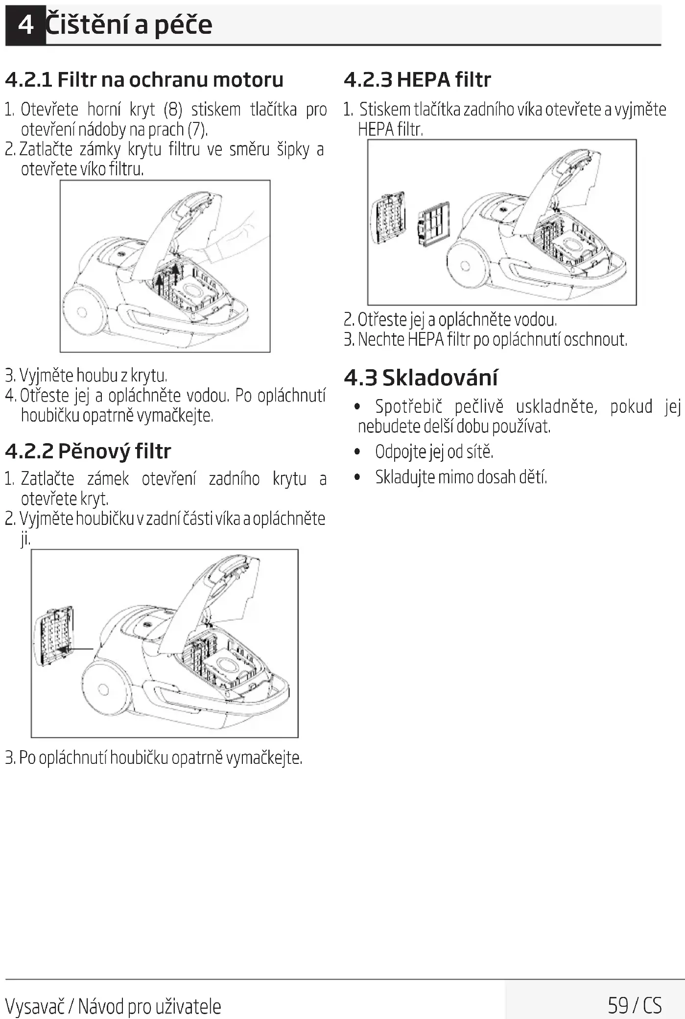 Почиствайте филтрите след смяна на всеки 5 торби за прах (може да варира в зависимост от честотата и площта на ползване). Когато почиствате натрупаната прах в контейнера за прах, трябва да почистите защитния филтър на мотора, филтъра от пяна и филтъра HEPA също.