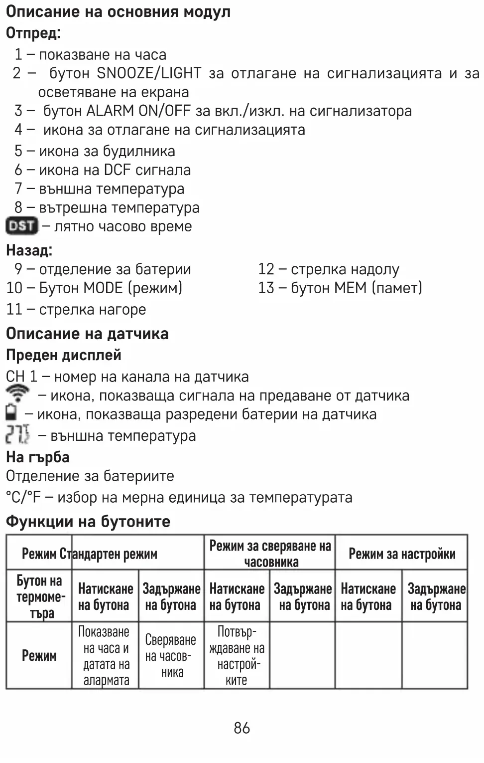 стойностите по-бързо.90 Превключване между °C/°F мерни единици за температура Неколкократното натискане на бутоните / ще превключи между мерните единици за температура °C или °F. Режим на дисплея Неколкократното натискане на бутона MODE ще покаже на дисплея: точно време – време за сигнализация – дата. Настройки на алармата Задържането на бутона ВКЛ./ИЗКЛ. НА АЛАРМАТА и използването на бутоните / ще зададе времето за сигнализация. Придвижвайте се между стойностите с помощта на бутона ВКЛ./ ИЗКЛ. НА АЛАРМАТА. Натиснете бутона ВКЛ./ИЗКЛ. НА АЛАРМАТА, за да нагласите часа и минутите. Иконата показва, че сигнализацията е активна. Натиснете отново бутона ВКЛ./ИЗКЛ. НА АЛАРМАТА, за да изключите сигнализацията; иконата звънец ще изчезне. Функции за повтаряне на алармата и осветяване на екрана Натиснете бутона SNOOZE/LIGHT (ПОВТАРЯНЕ НА АЛАРМАТА И ОСВЕТЯВАНЕ НА ЕКРАНА), когато алармата прозвучи, за да я отложите с около 5 минути. Дисплеят ще покаже иконата „Zz“. За да отмените функцията за отлагане, натиснете който и да е бутон освен SNOOZE/LIGHT (ОТЛАГАНЕ НА АЛАРМАТА И ОСВЕТЯВАНЕ НА ЕКРАНА). Ако не желаете да използвате функцията за отлагане, натиснете който и да е бутон освен SNOOZE/LIGHT (ОТЛАГАНЕ НА АЛАРМАТА И ОСВЕТЯВАНЕ НА ЕКРАНА), когато алармата прозвучи; алармата ще се включи отново на следващия ден. Ако не натиснете бутон, докато алармата звучи, алармата ще бъде активна за 2 минути и след това ще се включи на следващия ден. Натиснете бутона SNOOZE/LIGHT (ОТЛАГАНЕ НА АЛАРМАТА И ОСВЕТЯВАНЕ НА ЕКРАНА), докато сте в стандартен режим, за да активирате осветяването на дисплея за 10 секунди. Памет за измерени стойности Натиснете неколкократно бутона MEM (ПАМЕТ), за да се покажат постепенно на дисплея максималните и минималните отчитания на външната температура и вътрешната температура.91 За да изтриете паметта, задръжте бутона MEM (ПАМЕТ), когато сте в макс./мин. стойности на режим на дисплея. Обслужване и поддръжка Уредът е проектиран да работи без проблеми в продължение на много години, ако се използва правилно. По-долу са приведени някои препоръки за правилна експлоатация: