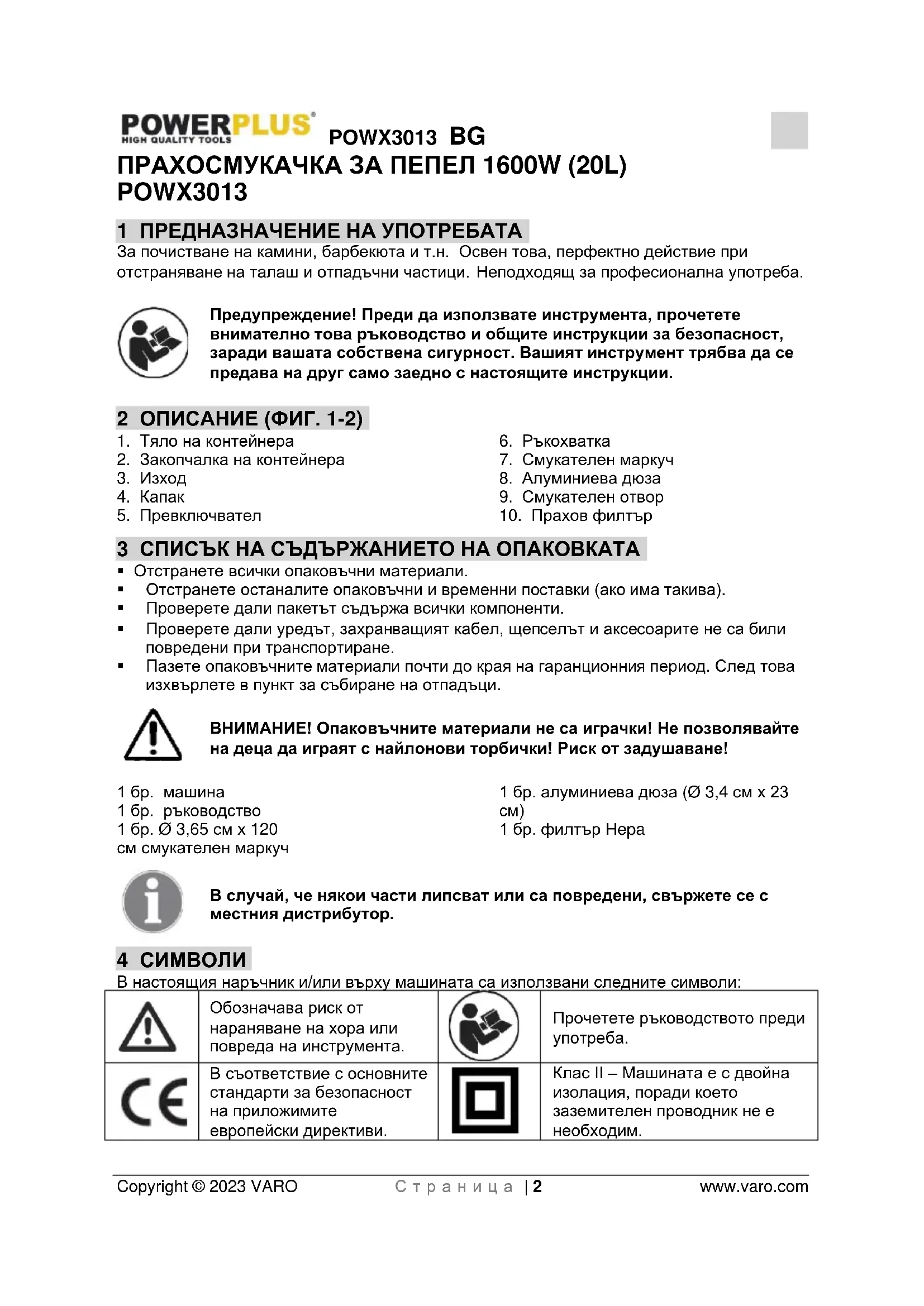 - Не използвайте прахосмукачката без контейнер за прах или без поставен прахов филтър.POWX3013 BG Copyright © 2023 VARO С т р а н и ц а | 5 www.varo.com