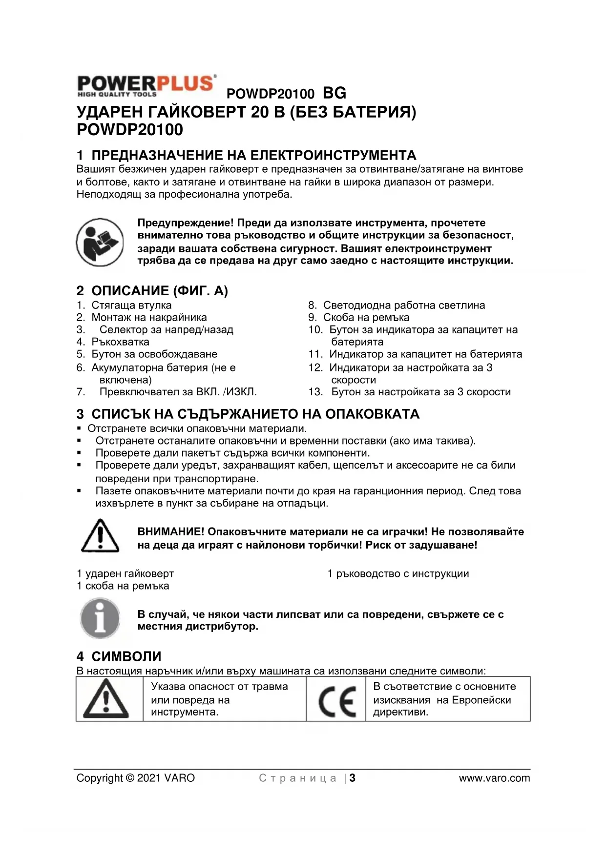 В съответствие с основните изисквания на Европейски директиви.POWDP20100 BG Copyright © 2021 VARO С т р а н и ц а | 4 www.varo.com