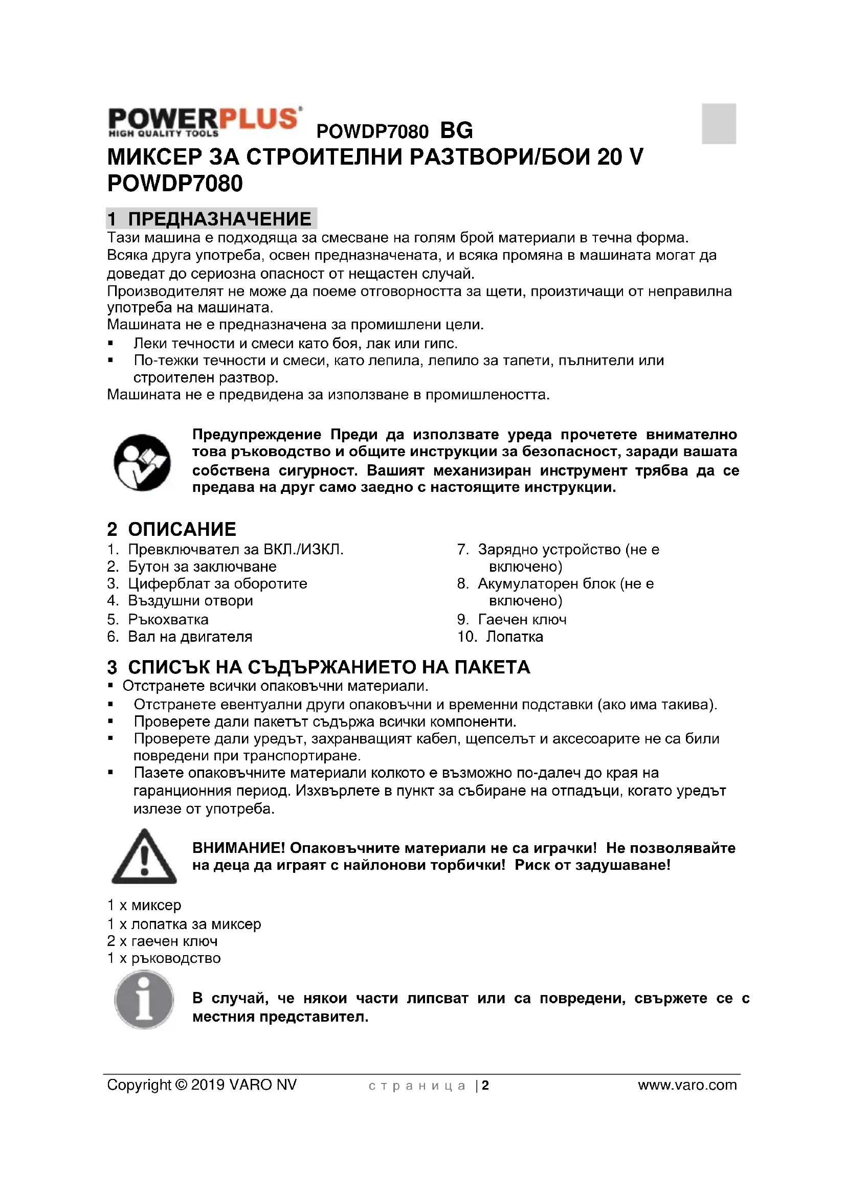 - Трябва да върнете недемонтирания инструмент на продавача в приемливо чисто състояние, в оригиналното му лято куфарче, ако устройството има такова, придружавано от доказателството за покупката. 15 ОКОЛНА СРЕДА В случай, че вашият електрически уред се нуждае от смяна, не го изхвърляйте в домашната кофа за болклук, а го изхвърлете по екологически-безопасен начин. Отпадъчните електрически уреди не трябва да се изхвърлят заедно с домашния боклук. Моля рециклирайте в предназначените за целта места.POWDP7080 BG Copyright © 2019 VARO NV с т р а н и ц а | 12 www.varo.com Обърнете се към местните власти или към продавача за съвет относно рециклирането. 16 ДЕКЛАРАЦИЯ ЗА СЪОТВЕТСТВИЕ С VARO N.V. – Joseph Van Instraat 9 – BE2500 Lier – Белгия декларират, че Тип машина: Миксер За Строителни Разтвори/Бои Марка:POWERplus Номер на артикула: POWDP7080 е в съответствие с основните изисквания и други съответни разпоредби на приложимите Европейски директиви, базирани върху прилагането на Европейските хармонизирани стандарти. Всяка неупълномощена модификация на апарата анулира тази декларация. Европейски директиви (включително техните промени към датата на подписване, ако са приложими); 2011/65/EU 2006/42/EC 2014/30/EU Европейски хармонизирани стандарти (включително техните промени към датата на подписване, ако са приложими); EN62841-1 : 2015 EN62841-2-10 : 2017 EN55014-1 : 2017 EN55014-2 : 2015 Съхранител на техническата документация: Филип Ванкеркхов, VARO – Vic. Van Rompuy N.V. Долуподписаният действа от името на Изпълнителния директор на компанията, Hugo Cuypers Регулационни въпроси – мениджър по съответствията Date: 30/10/2018, Lier - BelgiumWWW.VARO.COM