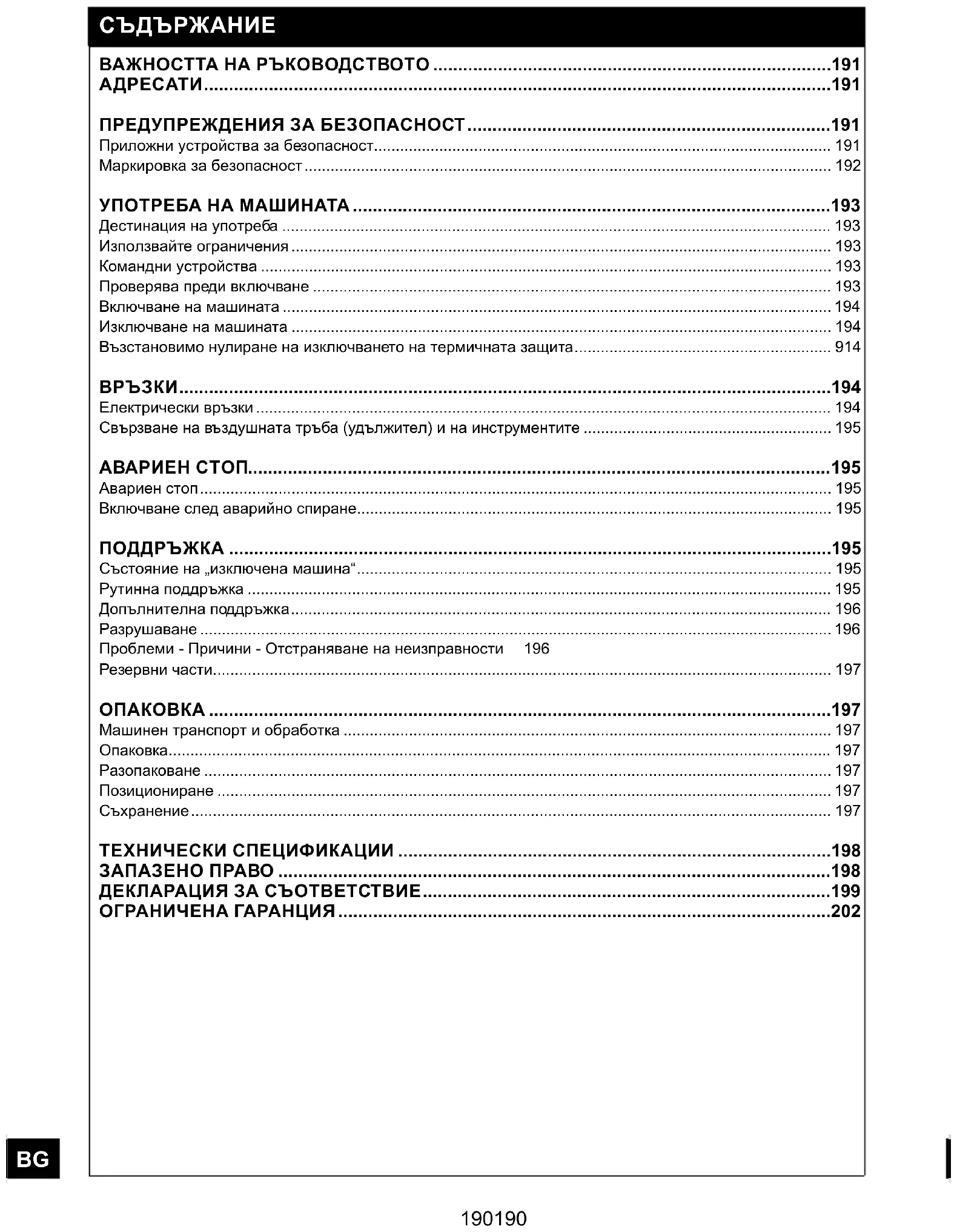 ПРЕДУПРЕЖДЕНИЯ ЗА БЕЗОПАСНОСТ Производителят не може да носи отговорност за щети на хора, животни и вещи, поради неспазване на стандартите и инструкциите, описани в това ръководство. Ръководството задължително трябва да бъде доставено заедно с машината, в случай че последното бъде прехвърлено на друг потребител. Това ръководство отговаря на състоянието на техниката, когато машината се търгува и не може да се счита за неподходящо, само защото следвайки нови преживявания, то може да бъде актуализирано. В случай на загуба или износване на ръководството, изискайте ново копие от производителя или оторизиран дилър, посочвайки модела на машината и редакцията, цитирана на корицата. ПРИЛОЖЕНИ БЕЗОПАСНИ УСТРОЙСТВА