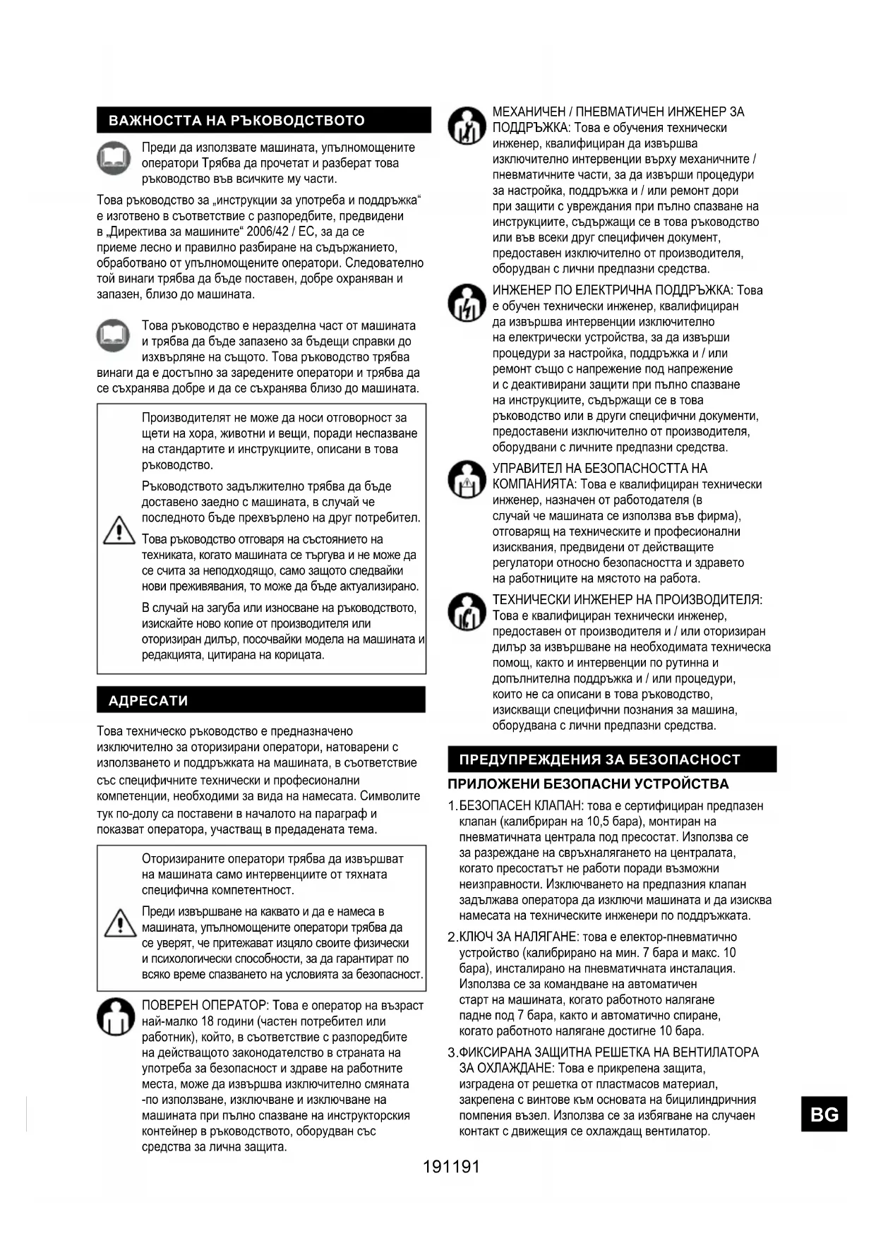 ПРЕДУПРЕЖДЕНИЯ ЗА БЕЗОПАСНОСТ Производителят не може да носи отговорност за щети на хора, животни и вещи, поради неспазване на стандартите и инструкциите, описани в това ръководство. Ръководството задължително трябва да бъде доставено заедно с машината, в случай че последното бъде прехвърлено на друг потребител. Това ръководство отговаря на състоянието на техниката, когато машината се търгува и не може да се счита за неподходящо, само защото следвайки нови преживявания, то може да бъде актуализирано. В случай на загуба или износване на ръководството, изискайте ново копие от производителя или оторизиран дилър, посочвайки модела на машината и редакцията, цитирана на корицата. ПРИЛОЖЕНИ БЕЗОПАСНИ УСТРОЙСТВА