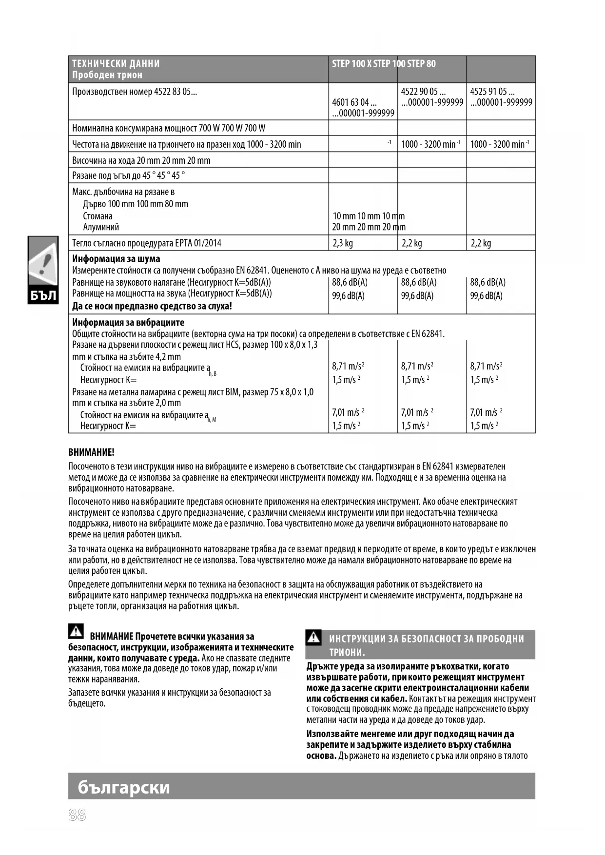 Височина на хода 20 mm 20 mm 20 mm Рязане под ъгъл до 45 ° 45 ° 45 ° Макс. дълбочина на рязане в Дърво 100 mm 100 mm 80 mm Стомана 10 mm 10 mm 10 mm Алуминий 20 mm 20 mm 20 mm Тегло съгласно процедурата EPTA 01/2014 2,3 kg 2,2 kg 2,2 kg Информация за шума Измерените стойности са получени съобразно EN 62841. Оцененото с A ниво на шума на уреда е съответно Равнище на звуковото налягане (Несигурност K=5dB(A)) Равнище на мощността на звука (Несигурност K=5dB(A)) Да се носи предпазно средство за слуха! 88,6 dB(A) 99,6 dB(A) 88,6 dB(A) 99,6 dB(A) 88,6 dB(A) 99,6 dB(A) Информация за вибрациите Общите стойности на вибрациите (векторна сума на три посоки) са определени в съответствие с EN 62841. Рязане на дървени плоскости с режещ лист HCS, размер 100 x 8,0 x 1,3 mm и стъпка на зъбите 4,2 mm Стойност на емисии на вибрациите a h, B Несигурност K= 8,71 m/s