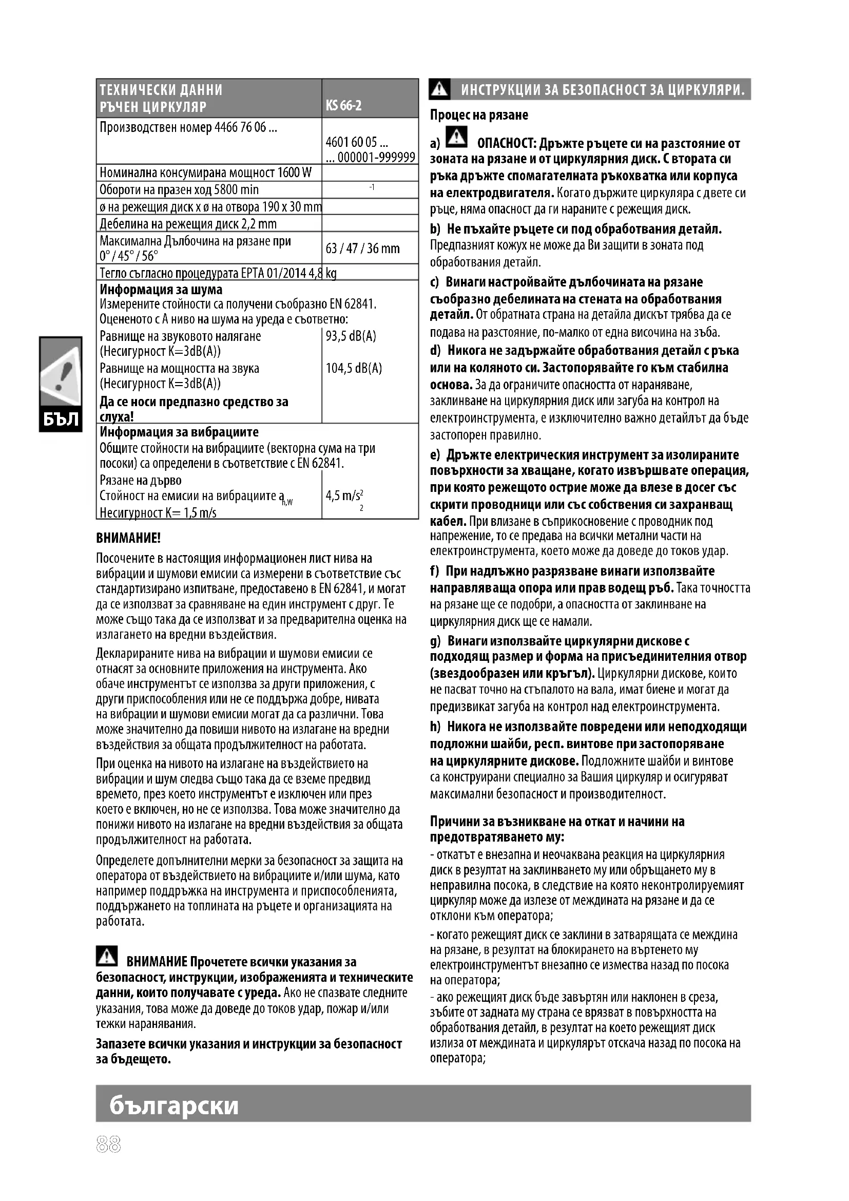 c) Отваряйте долния предпазен кожух са мо при изпълняване на специални срезове, напр. разрязване с пробиване или рязане в близост до ъгли. От во рете долния предпазен кожух с помощта на ръкохватката и я отпуснете веднага след като режещият диск пробие детайла. При всички други случаи долният предпазен кожух трябва да работи автоматично. d) Не оставяйте циркуляра на работния плот или на земята, без долният предпазен кожух да е покрил режещия диск. Незащитен циркулярен диск, който се върти, придвижва циркуляра в обратна посока и разрязва намиращите се на пътя му предмети. Затова се съобразявайте с необходимото за спирането на въртенето по инерция време. ДОПЪЛНИТЕЛНИ УКАЗАНИЯ ЗА РАБОТА И БЕЗОПАСНОСТ Носете средство за защита на слуха. Шумът може да доведе до загуба на слуха. Да се използват предпазни средства. При работа с машината винаги носете предпазни очила. Препоръчват се защитно облекло и прахозащитна маска, защитни ръкавици, здрави и нехлъзгащи се обувки, каска и предпазни средства за слуха. При работа на открито или когато в машината могат да попаднат влага или прах, се препоръчва уредът да се свързва чрез защитен прекъсвач за утечен ток с максимално 30 mA ток на задействане. Режещи дискове, които не отговарят на параметрите в настоящето упътване за експлоатация, не бива да се използват. Изберете режещ диск, подходящ за материала, който ще се