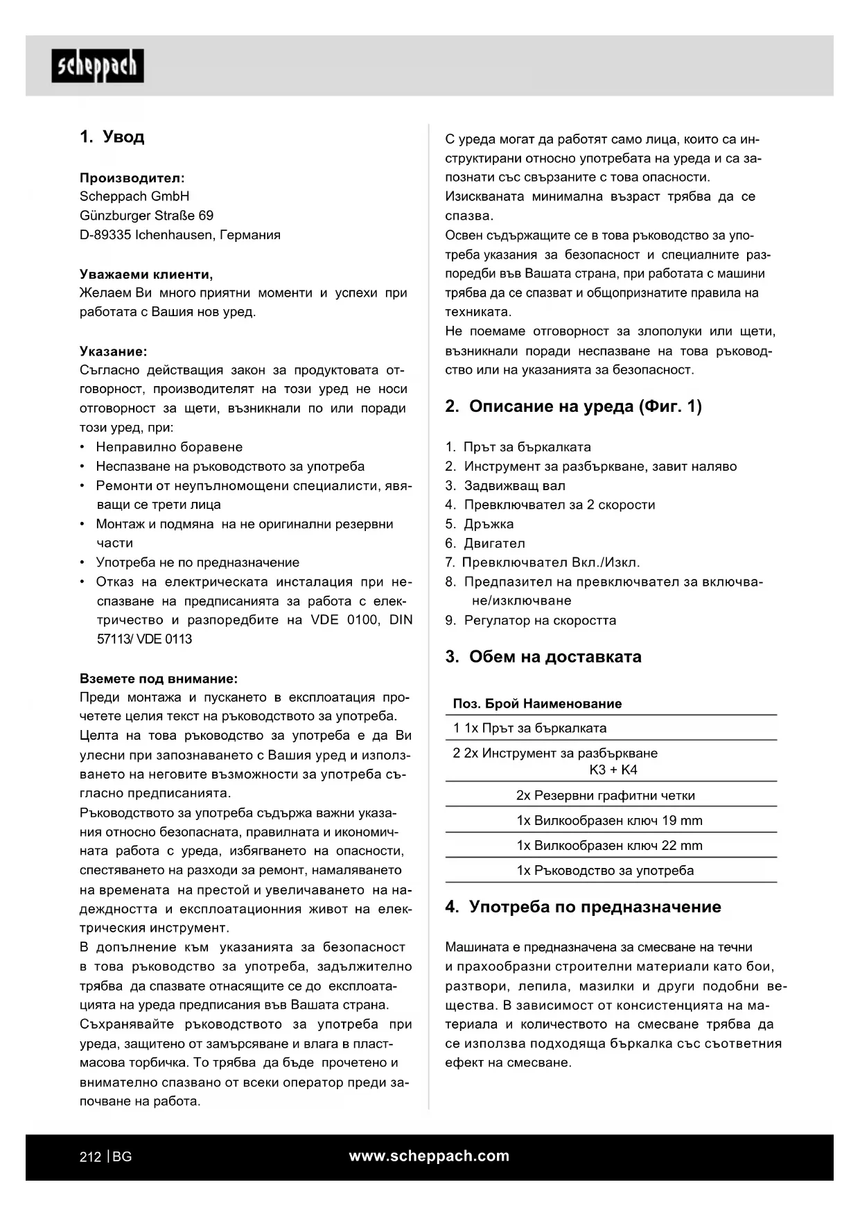 - Отказ на електрическата инсталация при не- спазване на предписанията за работа с елек- тричество и разпоредбите на VDE 0100, DIN 57113/ VDE 0113 Вземете под внимание: Преди монтажа и пускането в експлоатация про- четете целия текст на ръководството за употреба. Целта на това ръководство за употреба е да Ви улесни при запознаването с Вашия уред и използ- ването на неговите възможности за употреба съ- гласно предписанията. Ръководството за употреба съдържа важни указа- ния относно безопасната, правилната и икономич- ната работа с уреда, избягването на опасности, спестяването на разходи за ремонт, намаляването на времената на престой и увеличаването на на- деждността и експлоатационния живот на елек- трическия инструмент. В допълнение към указанията за безопасност в това ръководство за употреба, задължително трябва да спазвате отнасящите се до експлоата- цията на уреда предписания във Вашата страна. Съхранявайте ръководството за употреба при уреда, защитено от замърсяване и влага в пласт- масова торбичка. То трябва да бъде прочетено и внимателно спазвано от всеки оператор преди за- почване на работа.www.scheppach.com