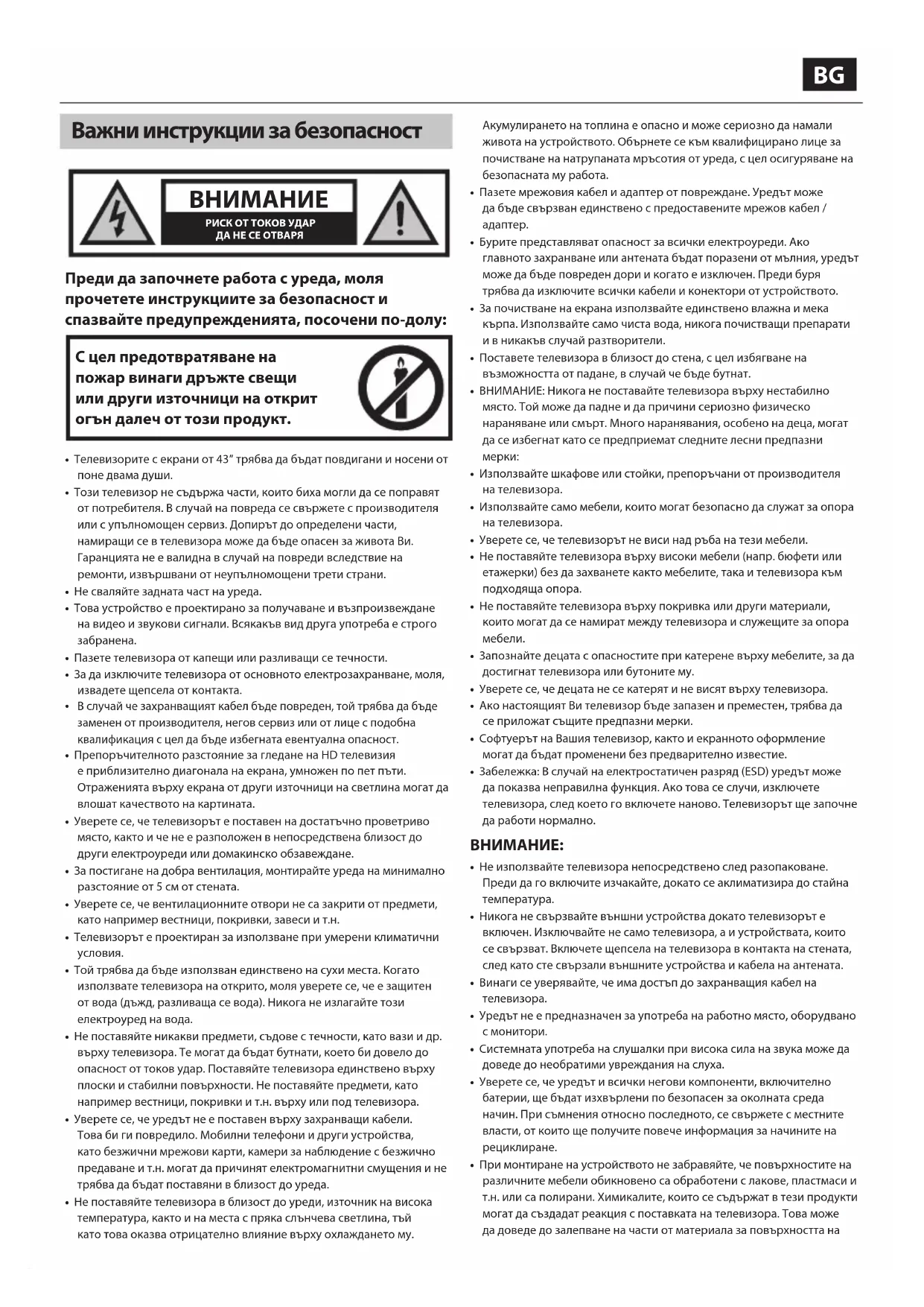 - Този телевизор не съдържа части, които биха могли да се поправят от потребителя. В случай на повреда се свържете с производителя или с упълномощен сервиз. Допирът до определени части, намиращи се в телевизора може да бъде опасен за живота Ви. Гаранцията не е валидна в случай на повреди вследствие на ремонти, извършвани от неупълномощени трети страни.