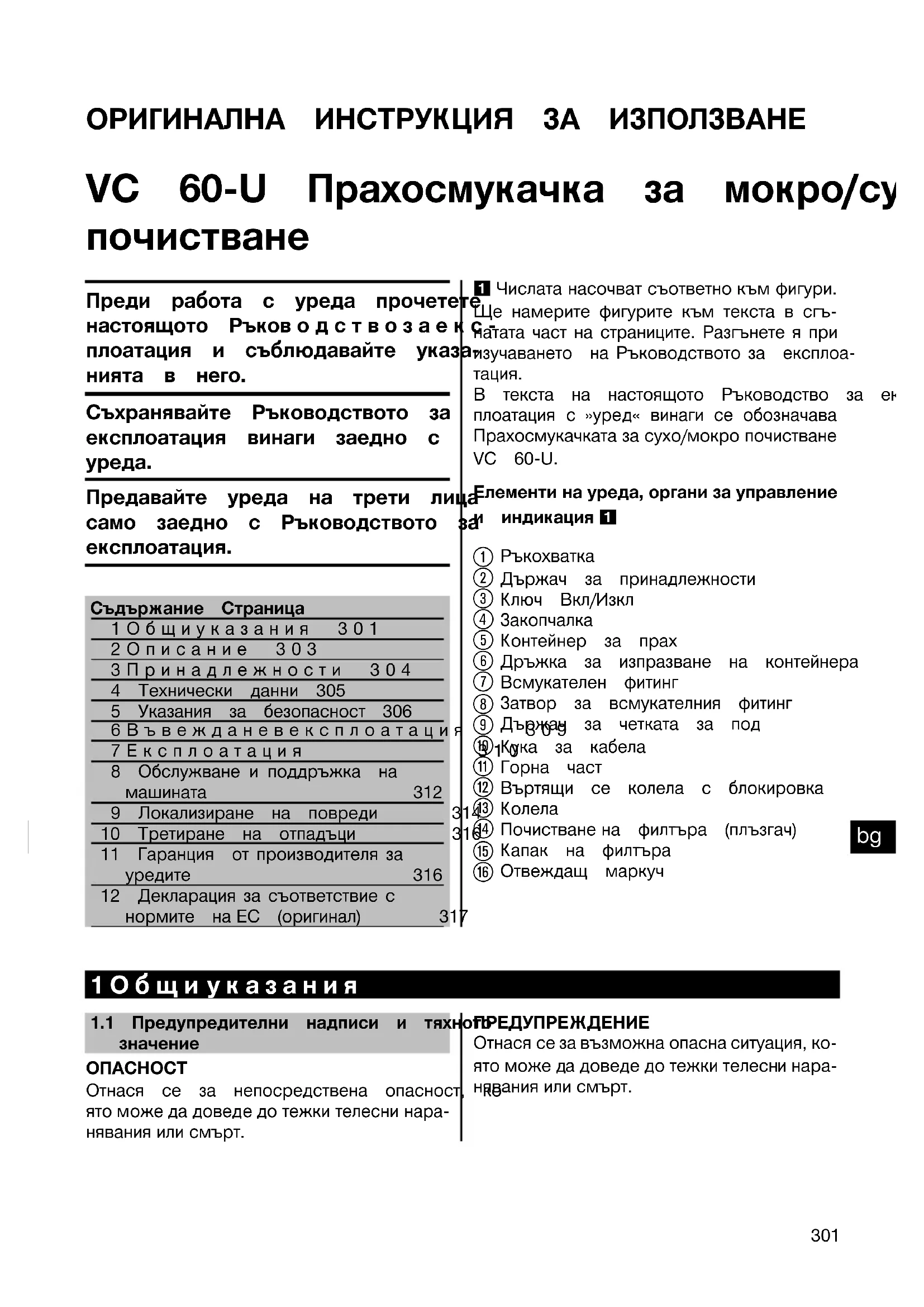 Преди работа с уреда прочететенастоящото Ръководствозаекс-плоатация и съблюдавайте указа-нията в него.Съхранявайте Ръководството заексплоатация винаги заедно суреда.Предавайте уреда на трети лицасамо заедно с Ръководството заексплоатация.Съдържание Страница1Общиуказания 3012Описание 3033Принадлежности 3044 Технически данни 3055 Указания за безопасност 3066Въвежданевексплоатация 3097Експлоатация 3108 Обслужване и поддръжка намашината 3129 Локализиране на повреди 31410 Третиране на отпадъци 31611 Гаранция от производителя зауредите 31612 Декларация за съответствие снормите на ЕС (оригинал) 317 1 Числата насочват съответно към фигури. Ще намерите фигурите към текста в сгъ- натата част на страниците. Разгънете я при изучаването на Ръководството за експлоа-тация.В текста на настоящото Ръководство за екс- плоатация с »уред« винаги се обозначава Прахосмукачката за сухо/мокро почистване VC 60‑U. Елементи на уреда, органи за управление и индикация 1