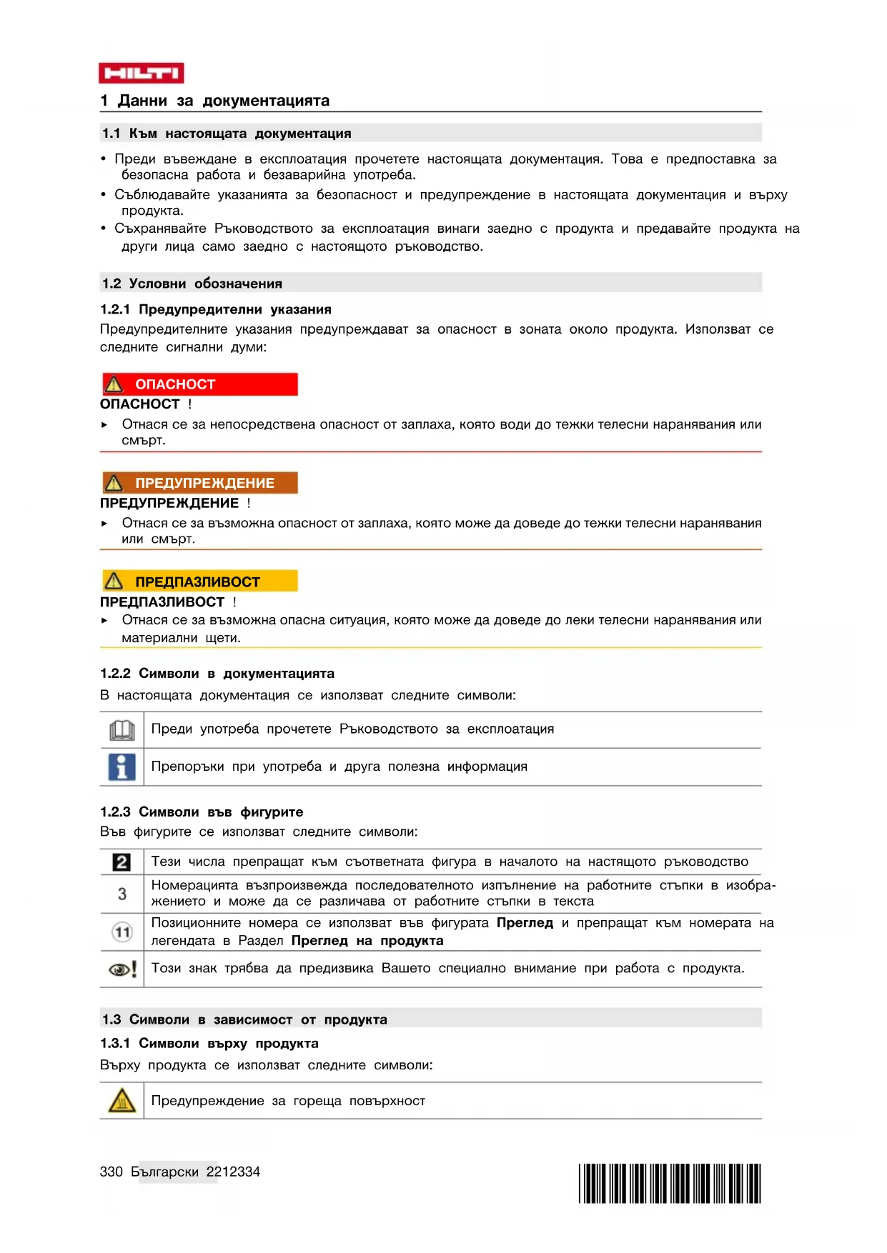 Ние декларираме на собствена отговорност, че описаният тук продукт отговаря на действащите директиви и стандарти. Копие на Декларацията за съответствие ще намерите в края на настоящата документация. Тук се съхранява Техническата документация: Hilti Entwicklungsgesellschaft mbH | Zulassung Geräte | Hiltistraße 6 | 86916 Kaufering, DE 2 Безопасност