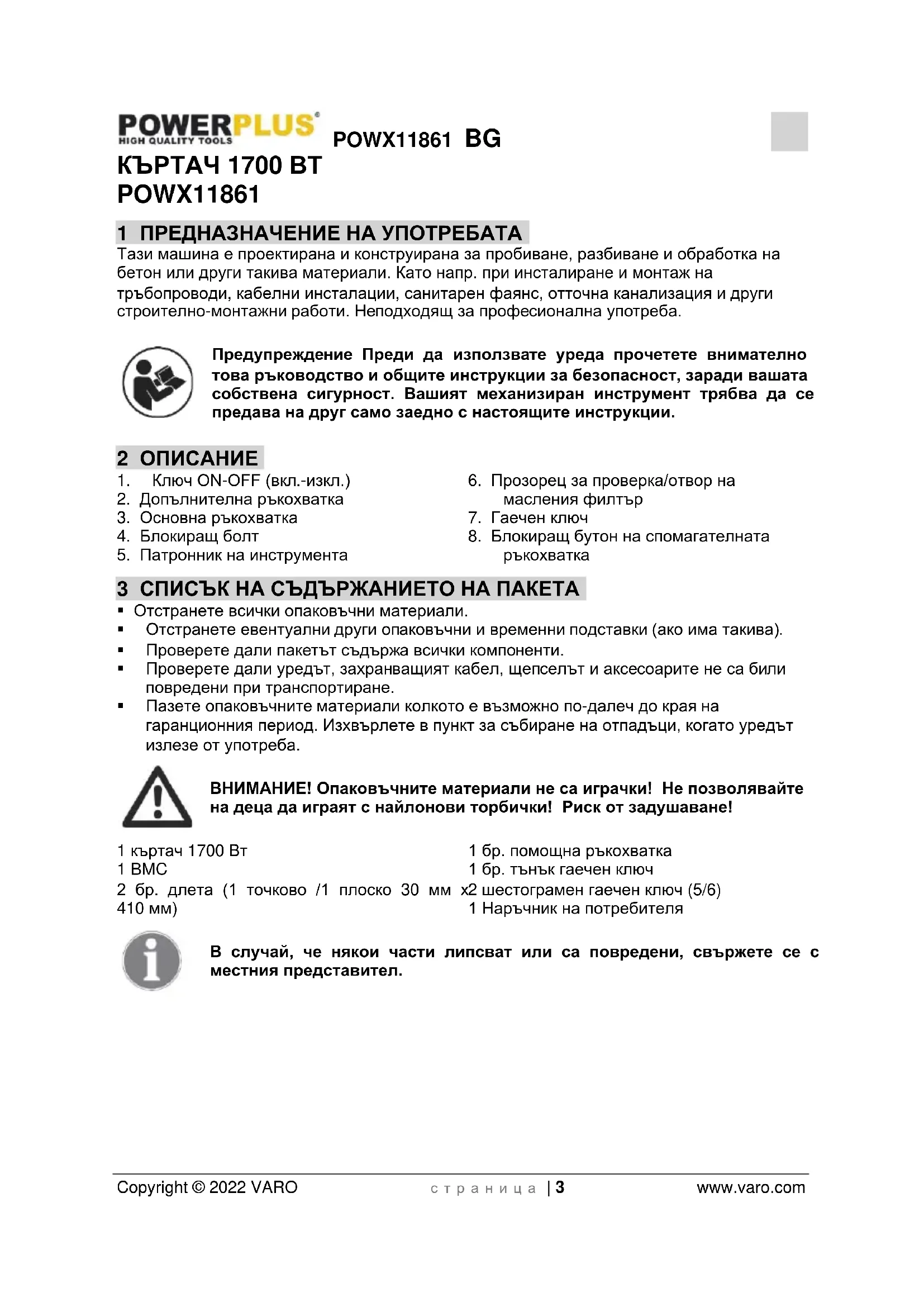 ВНИМАНИЕ: Не забравяйте да изключите захранването (OFF) и изключете щепсела, за да предотвратите сериозни неприятности.POWX11861 BG Copyright © 2022 VARO с т р а н и ц а | 9 www.varo.com