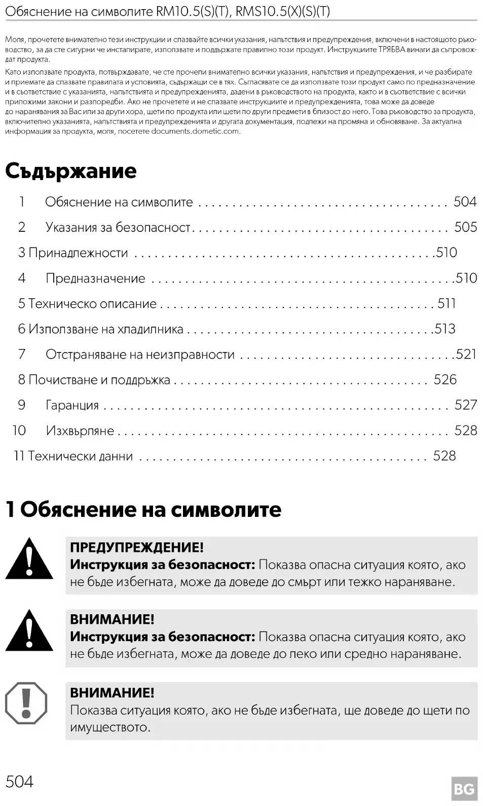 Моля, прочетете внимателно тези инструкции и спазвайте всички указания, напътствия и предупреждения, включени в настоящото ръко- водство, за да сте сигурни че инсталирате, използвате и поддържате правилно този продукт. Инструкциите ТРЯБВА винаги да съпровож- дат продукта. Като използвате продукта, потвърждавате, че сте прочели внимателно всички указания, напътствия и предупреждения, и че разбирате и приемате да спазвате правилата и условията, съдържащи се в тях. Съгласявате се да използвате този продукт само по предназначение и в съответствие с указанията, напътствията и предупрежденията, дадени в ръководството на продукта, както и в съответствие с всички приложими закони и разпоредби. Ако не прочетете и не спазвате инструкциите и предупрежденията, това може да доведе до наранявания за Вас или за други хора, щети по продукта или щети по други предмети в близост до него. Това ръководство за продукта, включително указанията, напътствията и предупрежденията и другата документация, подлежи на промяна и обновяване. За актуална информация за продукта, моля, посетете documents.dometic.com.