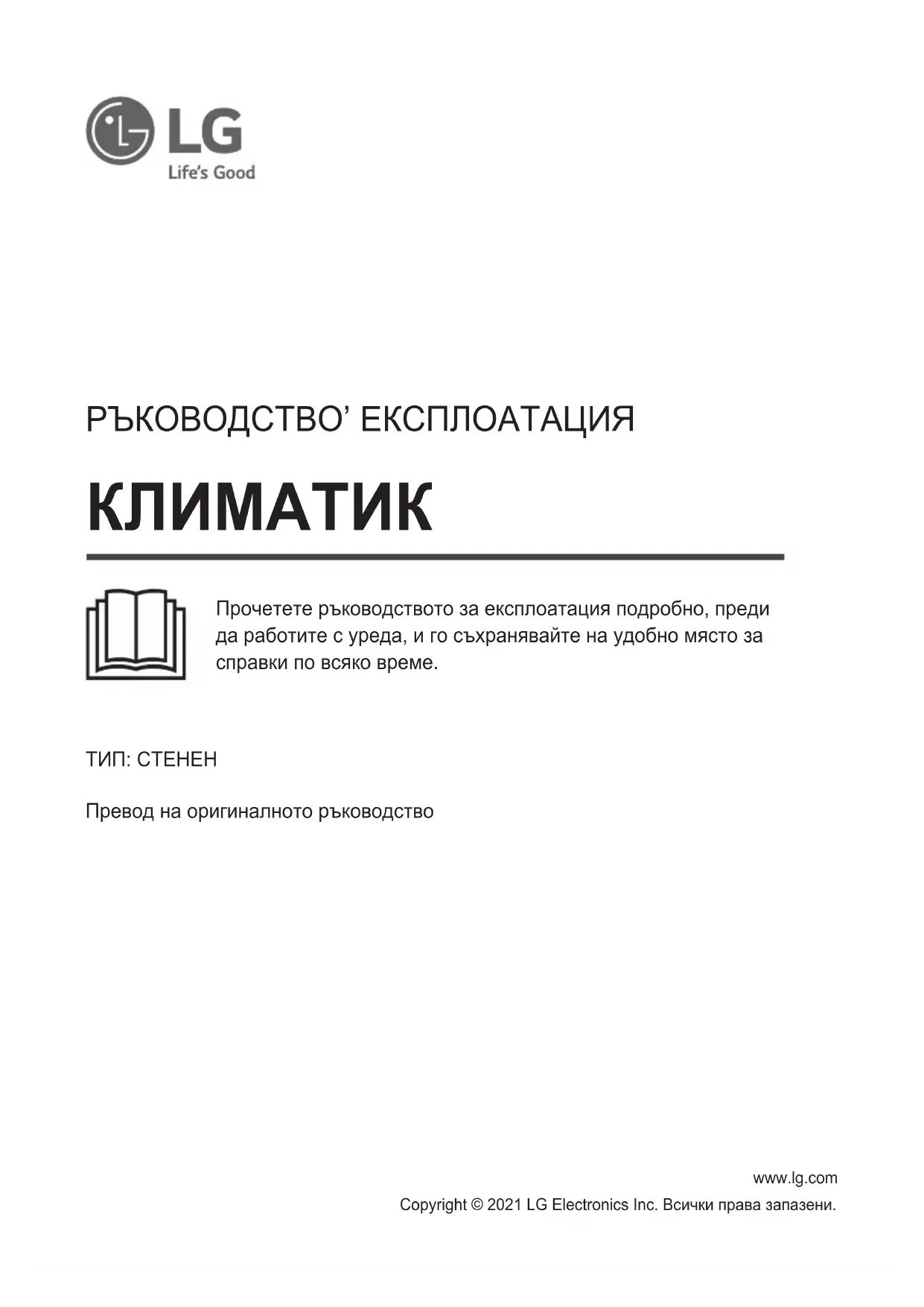 - Copyright © 2021 LG Electronics Inc. Всички права запазени. ТИП: СТЕНЕН Превод на оригиналното ръководство РЪКОВОДСТВО’ ЕКСПЛОАТАЦИЯ Прочетете ръководството за експлоатация подробно, преди да работите с уреда, и го съхранявайте на удобно място за справки по всяко време.СЪДЪРЖАНИЕ Това ръководство може да съдържа изображения или съдържание, различно от модела, който сте закупили. Ръководството подлежи на редакция от производителя. ИНСТРУКЦИИ ЗА БЕЗОПАСНОСТ p. 3