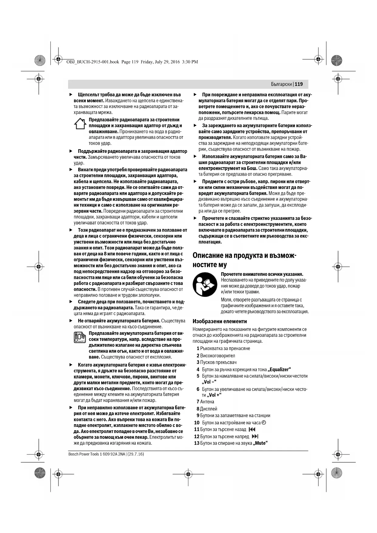 Прочетете внимателно всички указания. Неспазването на приведените по-долу указа- ния може да доведе до токов удар, пожар и/или тежки травми. Моля, отворете разгъващата се страница с графичните изображения и я оставете така, докато четете ръководството за експлоатация. Изобразени елементи Номерирането на показаните на фигурите компоненти се отнася до изображенията на радиоапарата за строителни площадки на графичната страница. 1 Ръкохватка за пренасяне 2 Високоговорител 3 Пусков прекъсвач 4 Бутон за ръчна корекция на тона „Equalizer“ 5 Бутон за намаляване на силата/високи/ниски честоти „Vol –“ 6 Бутон за увеличаване на силата/високи/ниски често- ти „Vol +“ 7 Антена 8 Дисплей 9 Бутони за запаметяване на станции 10 Бутон за настройване на часа 11 Бутон за търсене назад 12 Бутон за търсене напред 13 Бутон за спиране на звука „Mute“ OBJ_BUCH-2915-001.book Page 119 Friday, July 29, 2016 3:30 PM120 | Български 1 609 92A 2NA | (29.7.16) Bosch Power Tools 14 Бутон за избор на източника на звук „Source“ 15 Акумулаторна батерия* 16 Освобождаващи бутони за акумулаторната батерия 17 Гнездо за акумулаторната батерия 18 Винт за капака на гнездото за батерии 19 Капак на гнездото за батерии 20 Капак на кутията за съхраняване 21 Език за затваряне на капака на кутията 22 Куплунг за външен източник на звук „AUX IN“ 23 Куплунг за външно захранване 12 V 24 Захранващ адаптор 25 Щепсел за включване в уреда 26 Кабел за външен източник на звук *Изобразените на фигурите и описаните допълнителни приспо- собления не са включени в стандартната окомплектовка на уреда. Изчерпателен списък на допълнителните приспособле- ния можете да намерите съответно в каталога ни за допълни- телни приспособления. Елементи на дисплея a Поле за приеманата честота b Индикатор за състоянието на акумулаторната батерия c Указател за стерео-приемане d Индикатор за изключен звук e Мулти-функционално поле f Указател за избрания източник на звук Технически данни