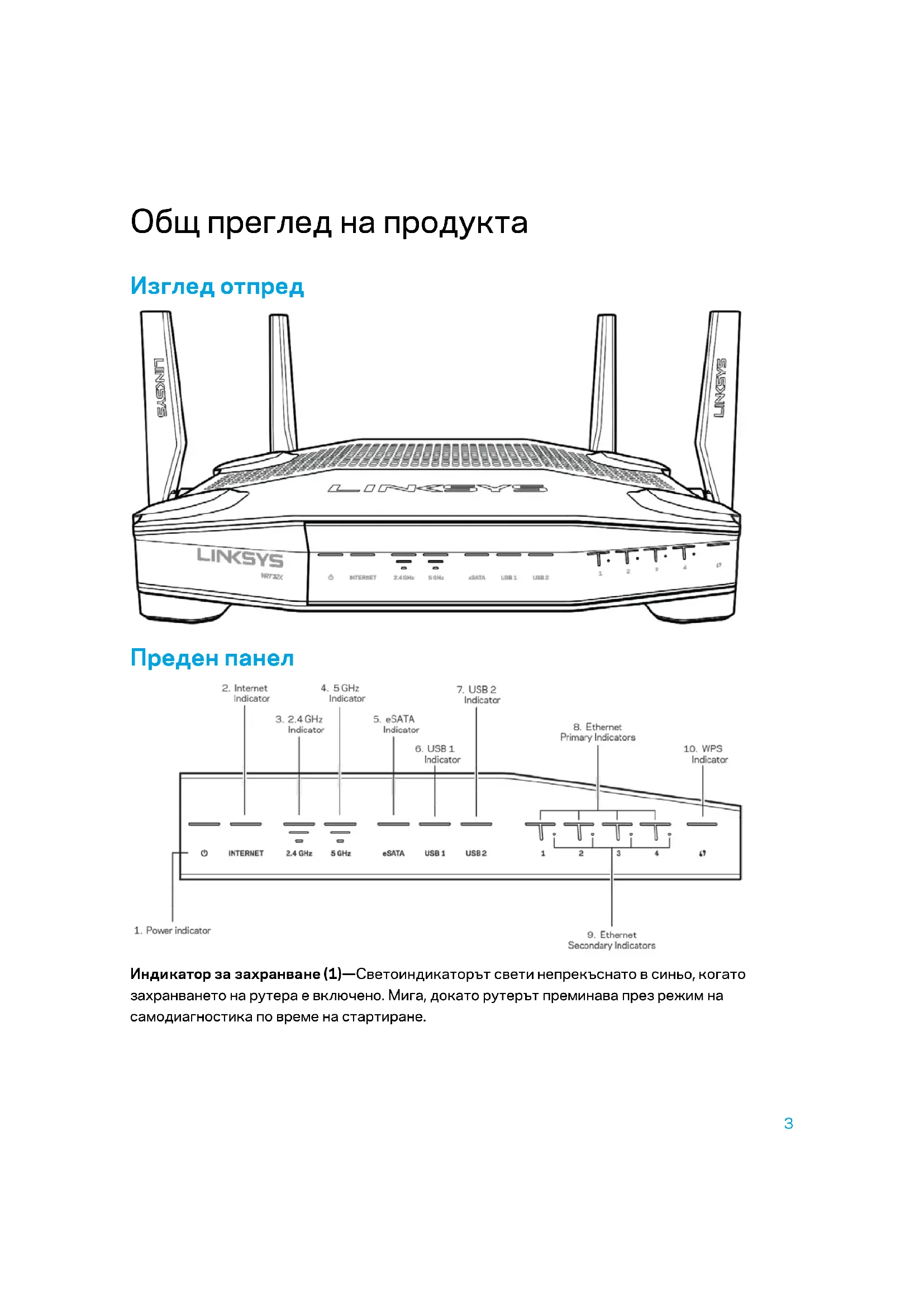 - Данни за околната среда Общ преглед на продукта Изглед отпред Преден панел Индикатор за захранване (1)—Светоиндикаторът свети непрекъснато в синьо, когато захранването на рутера е включено. Мига, докато рутерът преминава през режим на самодиагностика по време на стартиране.4 Индикатор за интернет (2)—Светоиндикаторът INTERNET свети непрекъснато в синьо при наличие на връзка с интернет. Мига, докато рутерът се опитва да установи връзка. Постоянна оранжева светлина на светоиндикатора означава, че връзката е прекъсната поради проблеми, свързани с конфигурацията. Примигваща оранжева светлина на светоиндикатора означава, че връзката е прекъсната поради проблеми с хардуера. Индикатор за 2,4 GHz (3)—Светоиндикаторът свети непрекъснато в синьо, когато един или повече клиенти са свързани към мрежата с честота 2,4 GHz. Светоиндикаторът мига, когато рутерът изпраща или получава данни чрез 2,4 GHz мрежа. Индикатор за 5 GHz (4)—Светоиндикаторът свети непрекъснато в синьо, когато един или повече клиенти са свързани към мрежата с честота 5 GHz. Светоиндикаторът мига, когато рутерът изпраща или получава данни чрез 5 GHz мрежа. Индикатор eSATA (5)—Когато не свети портът USB/eSATA е изключен или е свързано USB устройство. Светоиндикаторът свети непрекъснато в синьо, когато е свързано eSATA устройство. Светоиндикаторът примигва, за да покаже активност през порт eSATA. Индикатор USB1 (6)—Когато не свети портът USB/eSATA е изключен или е свързано eSATA устройство. Светоиндикаторът свети непрекъснато в синьо, когато е свързано USB устройство. Светоиндикаторът примигва, за да покаже активност през порта. Индикатор USB2 (7)— Светоиндикаторът свети непрекъснато в синьо, когато е свързано USB устройство. Светоиндикаторът примигва, за да покаже активност през порта. ETHERNET 1 през 4 (основни) (8)— Тези номерирани светоиндикатори отговарят на номерираните портове от задната страна на рутера. Ако светоиндикаторът свети непрекъснато в синьо, рутерът е свързан към устройство през този порт. Светлината примигва, за да покаже наличие на мрежова активност през този порт. ETHERNET 1 през 4 (спомагателни) (8)— Ако светоиндикаторът не свети, рутерът е свързан към устройство през този порт с 10/100 Mbps. Постоянна синя светлина показва, че рутерът е свързан към устройство с 1000 Mbps. Индикатор WPS (10)— Светоиндикаторът мига бавно в продължение на до две минути по време на Wi-Fi Protected Setup. Ще свети непрекъснато в синьо в продължение на пет секунди, за да покаже, че свързването е успешно. Примигваща оранжева светлина е индикация за неуспешен процес WPS. Ако това се случи, проверете дали устройството клиент поддържа WPS. Изчакайте, докато светоиндикаторът угасне, и след това опитайте отново. Рутерът не поддържа повече от една сесия WPS едновременно.5 p. 213